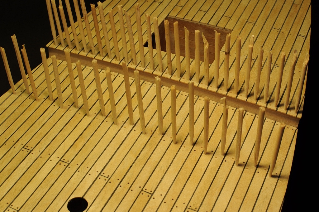 Wywierciłem otwory pod kołki w pokładzie. Otwory wykonałem furkadełkiem – wiertło Ø 0,7 mm. Aby ułatwić sobie pracę, linię wiercenia zaznaczyłem ołówkiem (później wytarte gumką). Celowo nie wykonałem otworów wzdłuż burt i włazów – zostaną wykonane po ich wklejeniu
