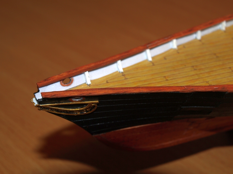 Na początek burty - skoro malowane ołowiem to dałem prawie czarne. Poszczególne segmenty podzielone zgodnie z układem planek. Darowałem sobie jednak wyginanie, gdyż skoro dechy udało się zamocować to i te skrawki papieru też. Dla uwypuklenia kształtu naklejone na dodatkową warstwę kartonu a'la blok techniczny a łączenia przeciągnięte igłą. Rozpocząłem od dziobu i aż do samej rufy szło w miarę dobrze. Powstawały miejscami szparki 0,5mm ale to wina bardziej doginania segmentów - na płasko pasują. Trochę starej szpachli i czarnej farbki załatwiło sprawę. Do ostatniego segmentu na rufie dodałem po kilka milimetrów, które przy przyklejaniu pawęży rufowej dociąłem. System ten zastosowany został m.in. w Alercie Shipyardu i dobrze się sprawdza.