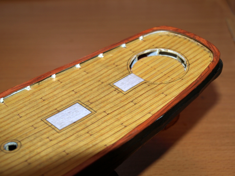 Włodzimierz Głowacki w "Dziejach jachtingu światowego" (Wydawnictwo Morskie, Gdańsk 1983) na str. 74 podaje, że Poszycie wykonano z jasnego dębu grubości 76mm, pokład z żółtej sosny grubości 64mm. Całe dno, aż do wysokości 15 cm ponad linie wodną, obite zostało blachą miedzianą, kadłub zaś z zewnątrz pomalowano jednolicie farbą koloru ołowiu, a wewnątrz farbą białą." Dlatego też planując pokład wykonałem go z wykorzystaniem wypełnień jasnym drewnem. Zgodnie z panującą wówczas "modą" kołkowanie desek pokładu na łączeniach jest co piątą (być może przybijane były gęściej, ale wtedy pokład byłby cały w kropeczkach) i zaznaczyłem najważniejsze pola osprzętu pokładowego. Wiem, ze w trakcie klejenia będzie trzeba uzupełniać zaznaczenia, ale to z czasem.
