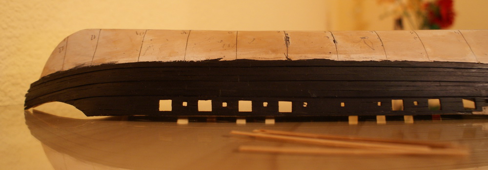 Tymczasem przygotowania do kładzenia drewienka na kadłubie. Planki będą miały 90 mm dł i 3 mm szerokości. Linie które widać na fotce w miejscu wręg, będą służyć do obliczania szerokości planek. Krawędzie planek zarysuję ołówkiem, myślę że po zaimpregnowaniu olejem duńskim da to ładny efekt.