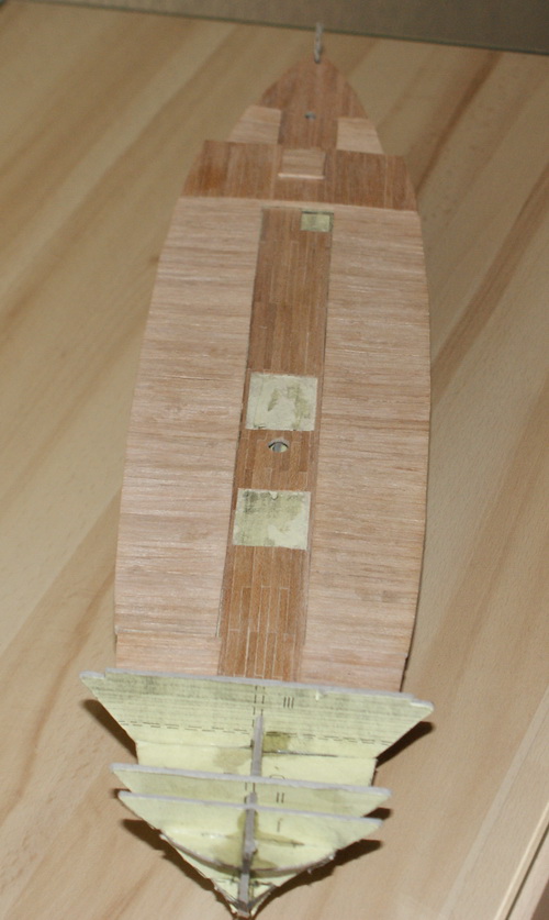 Tymczasem przygotowania do kładzenia drewienka na kadłubie. Planki będą miały 90 mm dł i 3 mm szerokości. Linie które widać na fotce w miejscu wręg, będą służyć do obliczania szerokości planek. Krawędzie planek zarysuję ołówkiem, myślę że po zaimpregnowaniu olejem duńskim da to ładny efekt.