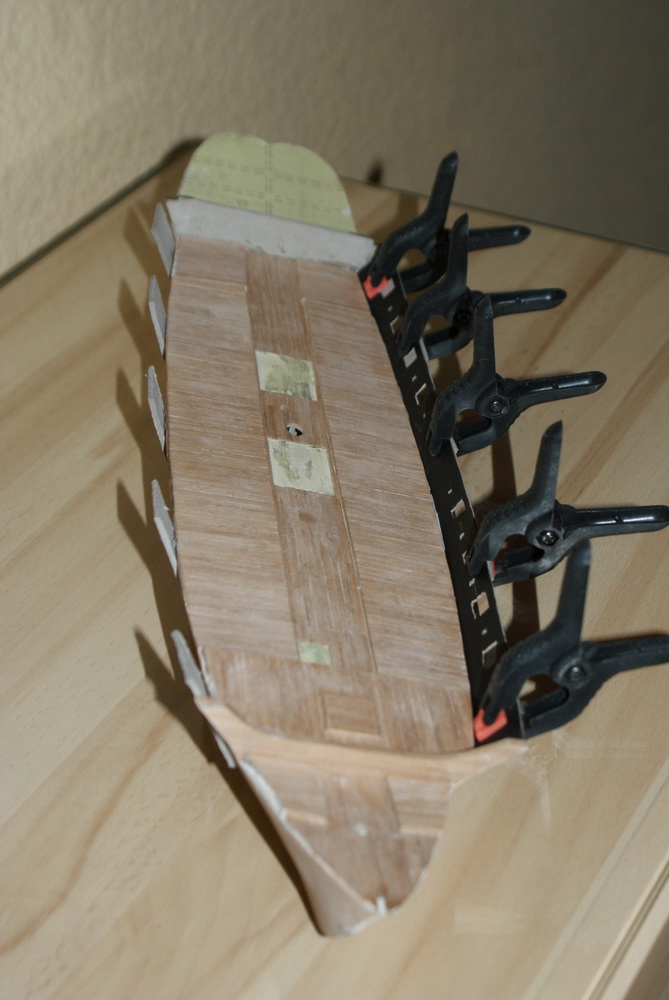 Tymczasem przygotowania do kładzenia drewienka na kadłubie. Planki będą miały 90 mm dł i 3 mm szerokości. Linie które widać na fotce w miejscu wręg, będą służyć do obliczania szerokości planek. Krawędzie planek zarysuję ołówkiem, myślę że po zaimpregnowaniu olejem duńskim da to ładny efekt.