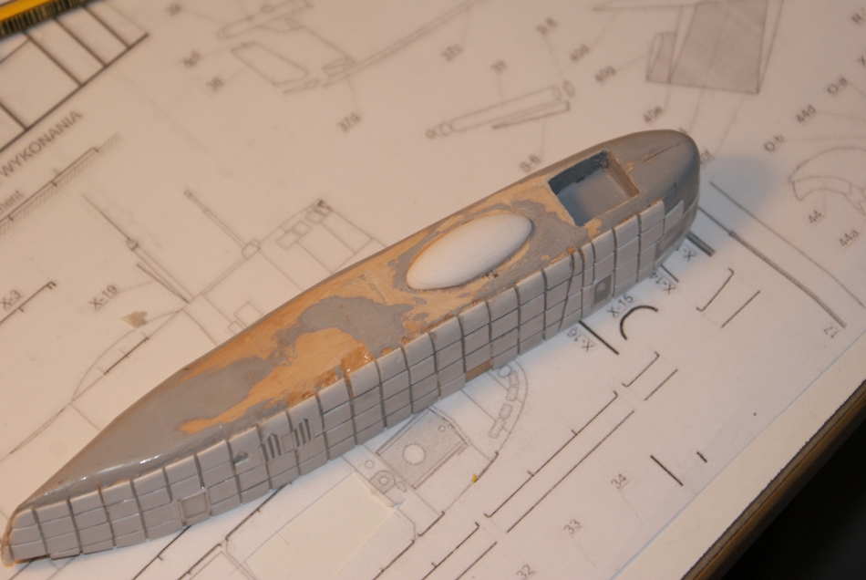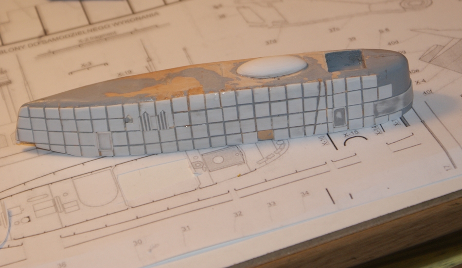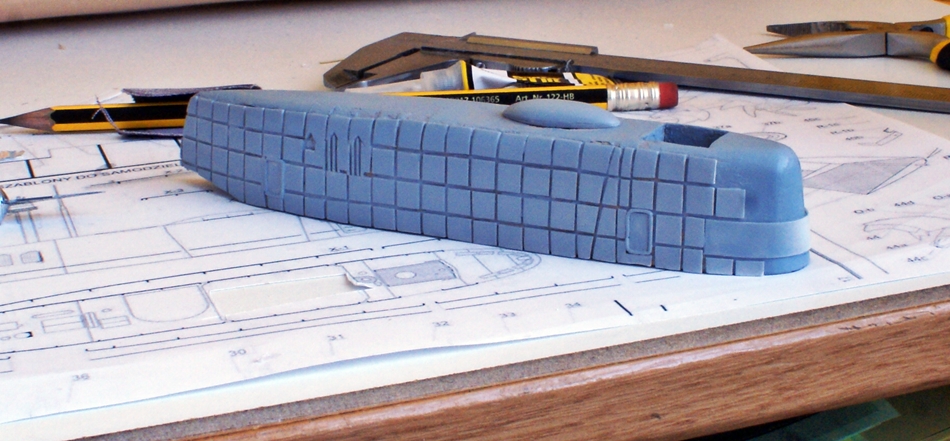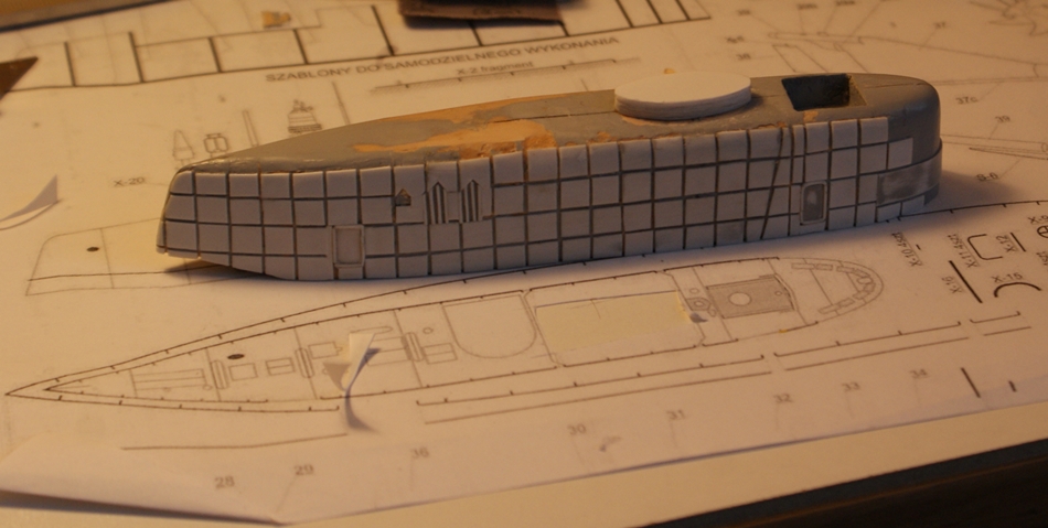Te kwadraciki z polistyrenu będą się Tobie śniły po nocy Wojtek bo jak będziesz tez obklejał kadłub nimi to będzie pewnie ponad 1000 lub więcej ale przynajmniej Model będzie się lepiej prezentował i na pewno na tym zyska.