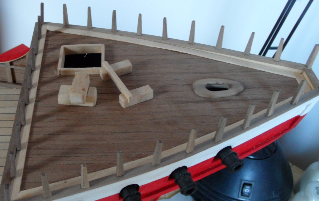 Przy pokładzie dziobowym męczyłem się z wykonaniem słupków, wymiar na dole słupka to 4mm a na górze 2mm. W związku z dużą ich ilością postanowiłem zrobić szablon, który myślę znacznie ułatwi ich wykonanie.