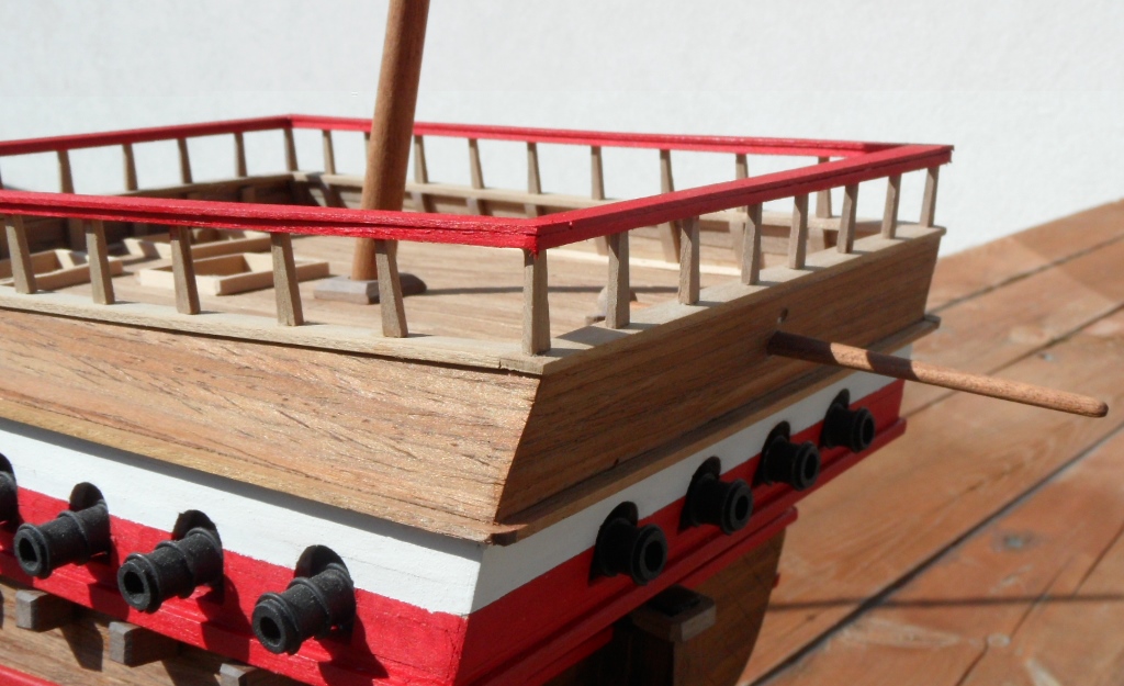 Przy kodze nie wiele zrobiłem (teraz wiosna, czas pracy w ogrodzie :D ). Doszły wszystkie drzewce, malowanie poręczy, wsporniki pod pokłady oraz trochę drobnicy. Różnice w odcieniu poszycia lub elementów pokładu, wynikają z tego, że jeszcze nie wszystko zdążyłem pomalować caponem.