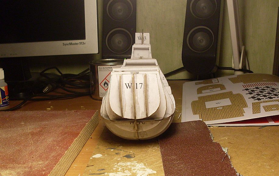 Na razie jednak skleiłem szkielet z tektury... chmm... Chyba wyszedłem z wprawy :-( Niby tyle skleiłem kartonówek i ciągle człowiek popełnia te same błędy... Ale co tam - brnę dalej jak już zacząłem.