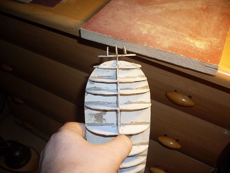 Cześć - oczywiście , że plan jest aby to zwichrowanie poprawić :-) . Na czas piankowania umocuję szkielet do deski , aby był prosty. Mam nadzieję, że po stwardnieniu pianki, nie będzie juz zwichrowany. Nierówność wręg poziomych trzeba będzie zaszpachlować i zeszlifować. Patrząc od dołu to przesunięcie wynosi około 1 mm. Niby nie dużo, ale może sprawić kłopot. Jak przykleję wręgi pokładu to będzie więcej widać. Martwi mnie to , bo w kartonówkach takie błędy wydruku są nagminne , a potem poprawki sprawiają sporo problemów.