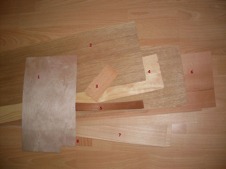 Zebrałem takie oto forniry - dla ułatwienia ponumerowałem. Nr 1 to chyba jest sklejka 0,5 bo bardzo cienka ale zbyt sztywna na fornir. 4 to sosna, 3 i 6 chyba buk. Pozostałe nie wiem