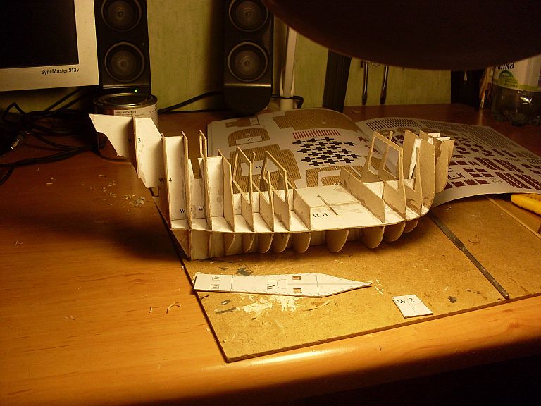 Na razie jednak skleiłem szkielet z tektury... chmm... Chyba wyszedłem z wprawy :-( Niby tyle skleiłem kartonówek i ciągle człowiek popełnia te same błędy... Ale co tam - brnę dalej jak już zacząłem.