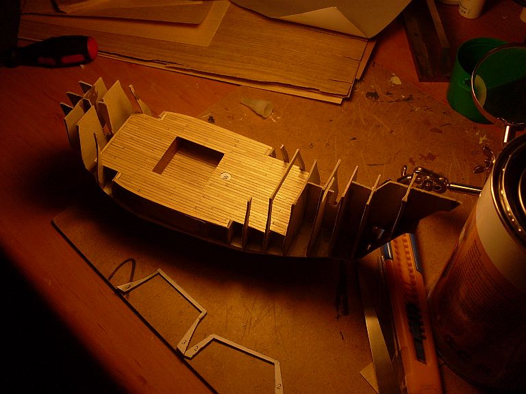 Po wyschnięciu wikolu pokład był całkiem sztywny, aż nawet za bardzo. Zaowocowało to brakiem możliwości zamontowania w kadłubie.