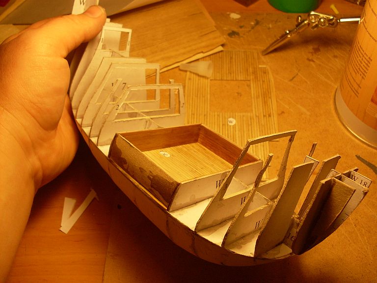 Przy okazji nie ustrzegłem się błędów - chciałem szybko wkleić pokład ładowni no i wyszło trochę nie równo - pofalował się... Na przyszłość będę bardziej musiał uważać
