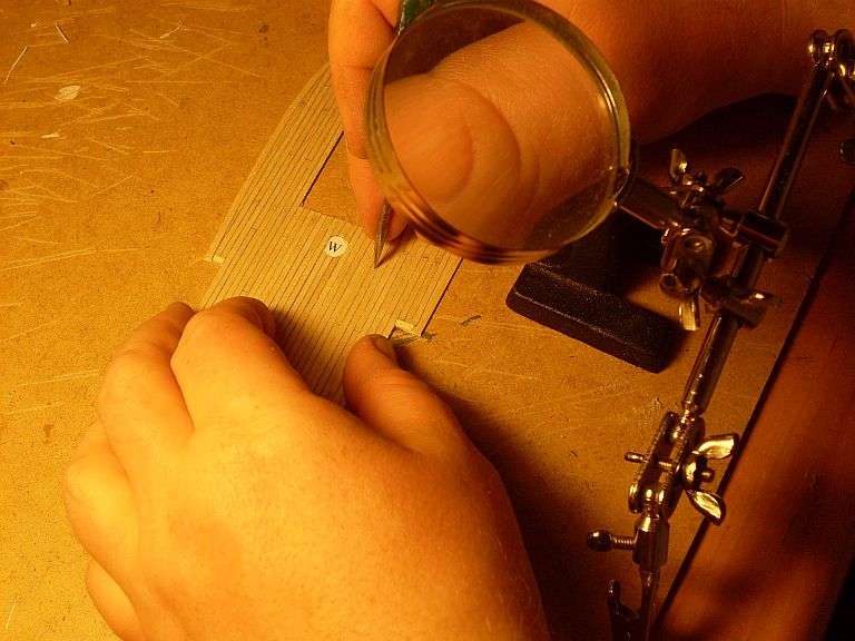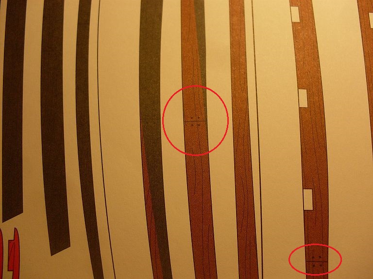 Proste paski forniru nie są do końca dobrym pomysłem. Nie da się poprawnie ułożyć zupełnie prostych listewek, aby poszycie ładnie wyglądało. I tak będziesz zmuszony zwężać je na dziobie, a na rufie wstawiać tzw. stealersy. Zwróć uwagę na to, że obło kadłuba na śródokręciu jest większe niż na dziobie. Zatem jeśli zastosujesz proste listewki, bez ich zwężania w odpowiednich miejscach, to ilość desek ze śródokręcia nie zmieści ci się na dziobie. Ponadto przetestuj sobie ułożenie takich kilku prostych listewek na kadłubie i zobacz jak się układają. Ja wprawdzie nie jestem specem od układania deseczek, więc może nie powinienem się wypowiadać, ale z moich osobistych testów wynika, że deski na śródokręciu będą leżały równolegle do linii wodnej, ale te na dziobie będą ostro wznosiły się do góry. To nie będzie dobrze wyglądać. A co do igły to wykorzystaj insulinówkę, jest naprawdę cienka.