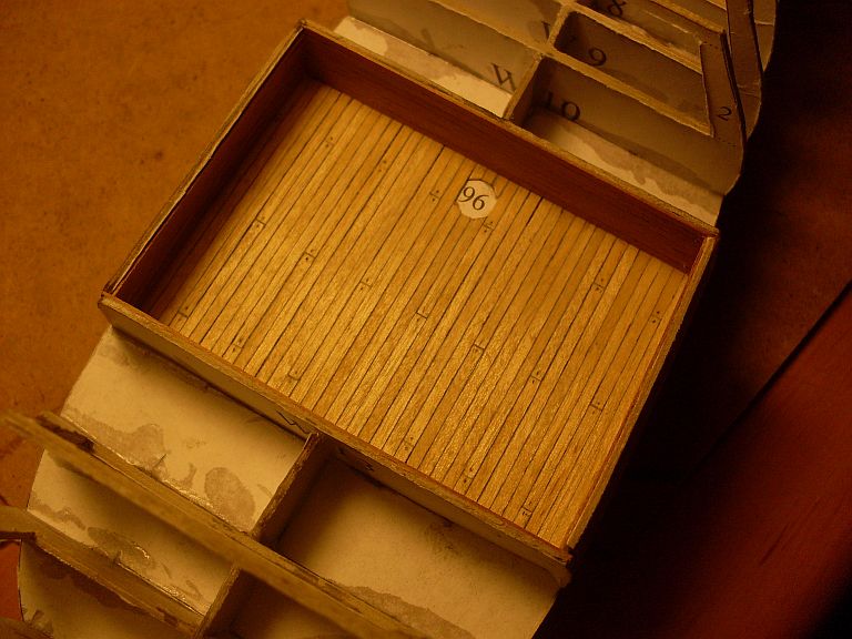 W sumie nie doczytałem się w innych relacjach... Zauważyłem, że cyklinowanie prawie zlikwidowało widoczność faktury deseczek. Na próbę na prawej ściance pomalowałem delikatnie krawędzie. No efekt w sumie taki sobie... zakładając , że na tę ładownię przyjdzie gretting, to mogłem w sumie zrobić ścianki z pełnego forniru , miast męczyć się z deseczkami... ale przynajmniej przećwiczyłem temat (widoczna szpara miedzy bokiem a wręgą, zniknie po wklejeniu deseczek).