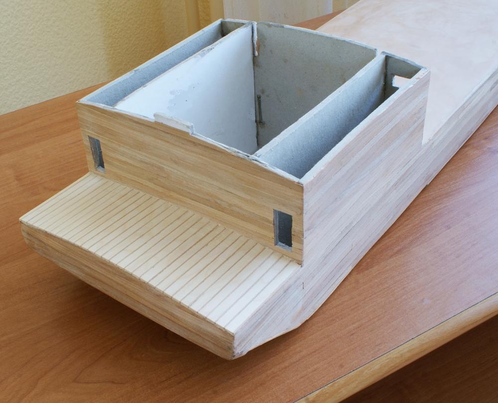 Nadbudówka zmontowana. Przymiarka do pokładu.