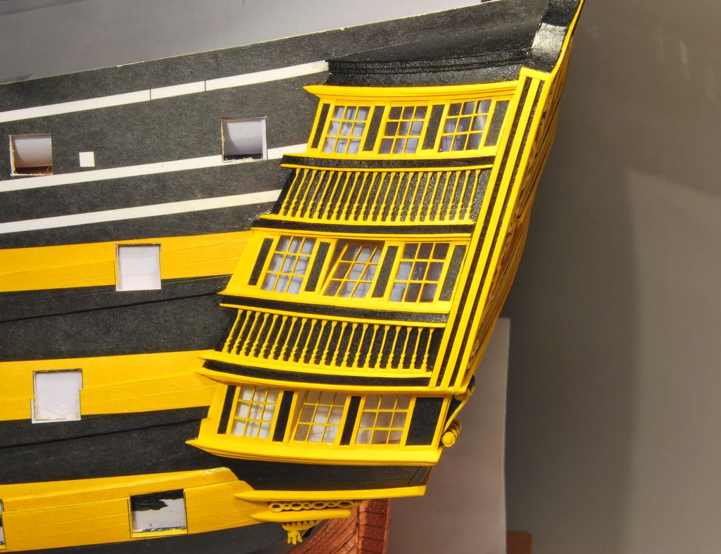 Po tych przygodach przeniosłem się na dziób i podzobałem przy sztukateriach około ubikacjowych (udało mi się uzyskać karton barwiony w masie w kolorze odpowiednim dla tego modelu czyli: żółty, niebieski, czerwony, brązowy i oczywiście czarny, co pozwoli uniknąć malowania i retuszu poza oczywoście drzewcami masztów i rej):