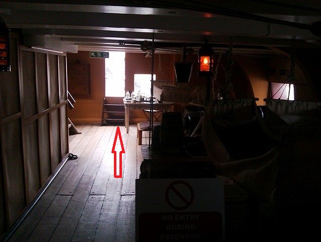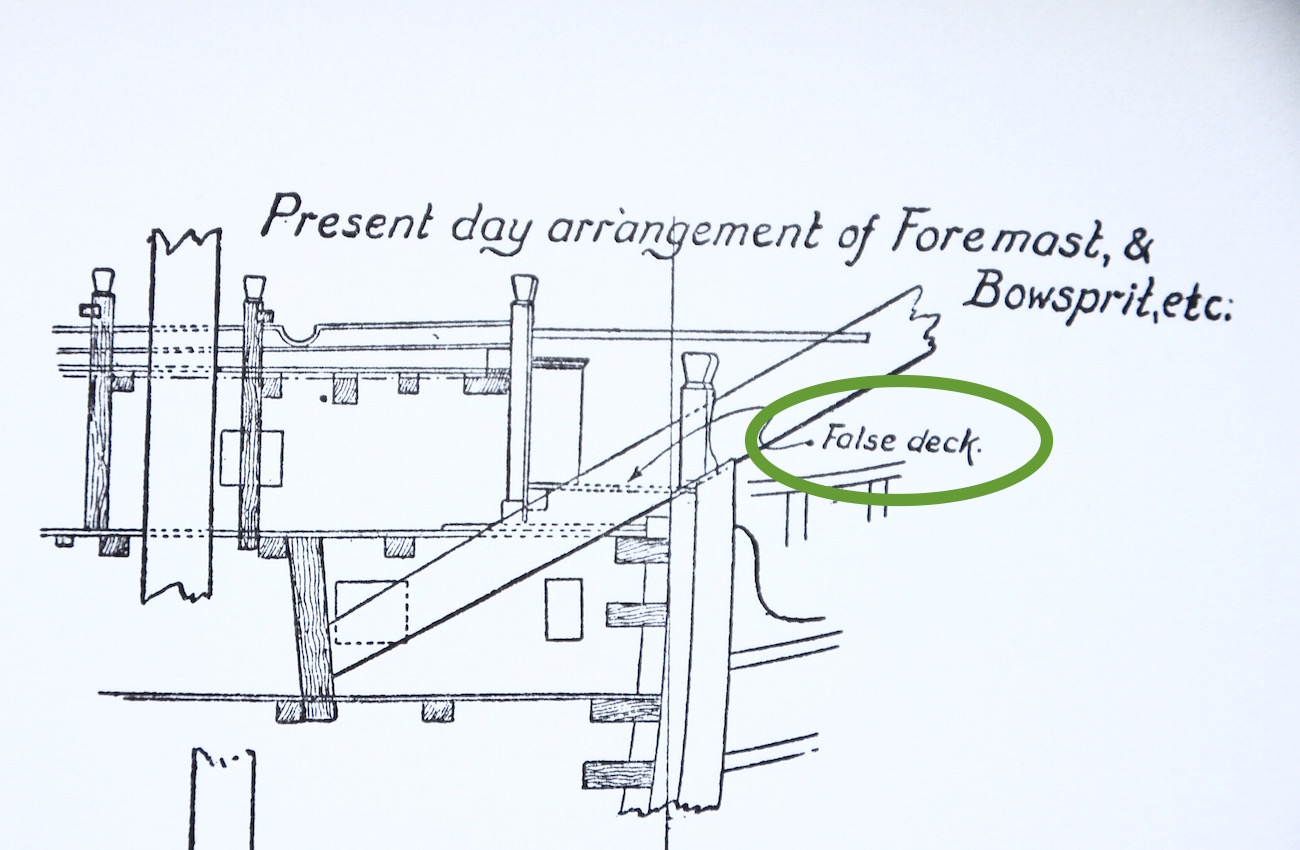 Taki nierówny układ tych pokładów można wywieść również z analizy zdjęć obecnego okrętu (co potwierdzałoby ryciny Longridge'a). Po pierwsze patrząc na zdjęcie górnego pokładu we wnętrzu okrętu, pokazane przez Artura (to ze schodkami) wyraźnie widać, że pomiędzy tym pokładem a otworem w dziobowej wrędze (Bulkhead) jest dodanych kilka desek; otwory te nie znajdują się dokładnie na tym samym poziomie co górny pokład, są wyraźnie wyżej. Patrząc na te sam otwory od strony zewnętrznej wręgi dziobowej widać wyraźnie, że ich dolne krawędzie stykają się z pokładem dziobowym; pomiędzy dolnymi krawędziami otworów a tym małym pokładem nie ma takiego progu, jaki widoczny jest od wewnętrznej strony otworów. To pozwala wnioskować, że istnieje różnica poziomów pomiędzy górnym pokładem znajdującym się za wręgą dziobową, a tym małym pokładem dziobowym znajdującym się przed dziobową wręgą. Kwestia tego, czy były tam kiedyś schodnie, czy jest to obecny wymysł, to już inna sprawa. Niemniej jednak w mojej ocenie, taka różnica między pokładami występuje w tym miejscu.