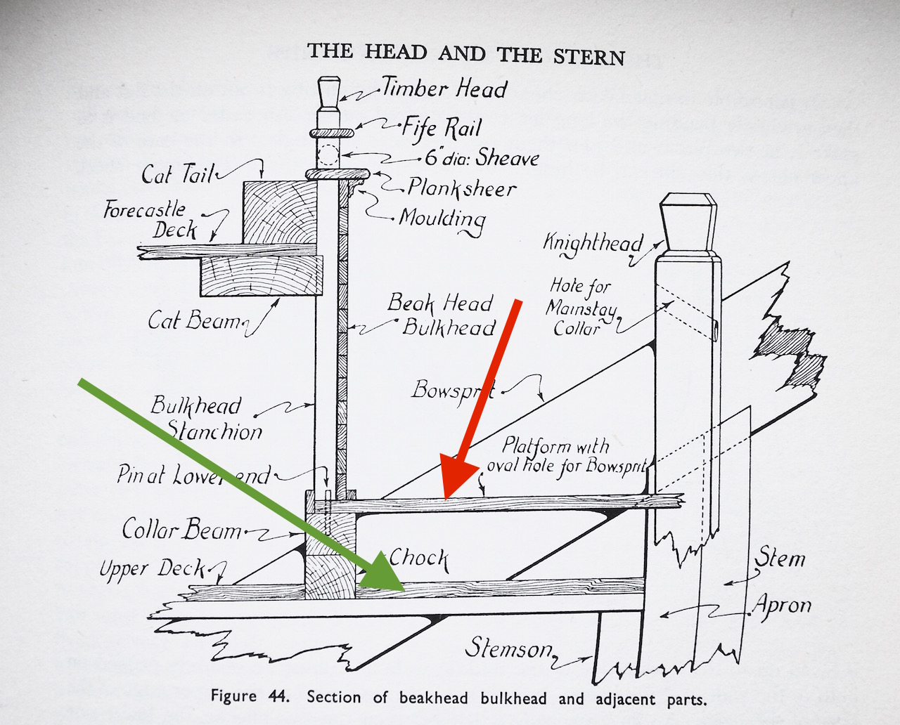 . A przechodząc ad rem, to moje wnioskowanie co do istnienia różnic w poziomach pomiędzy górnym pokładem (upper deck) a małym pokładem dziobowym, oparte jest przede wszystkim (ale nie tylko) na rysunkach znajdujących się w książce Longridge'a. Na rysunku poniżej górny pokład zaznaczyłem strzałką zieloną, natomiast dziobowy strzałką czerwoną.