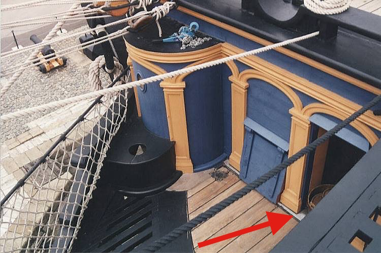 W tej samej sciance dzialowej (beakhead bulkhead), tuz obok, jest tez kwadratowe wyciecie na dodatkowy luk dzialowy, na dzialo, tzw. bow chaser, ktore tam ustawiano podczas poscigu za okretem nieprzyjaciela aby stamtad go razic ogniem. W pozostalych sytuacjach dziala tego tam nie ustawiano. Podobnie jest po drugiej stronie osi centralnej kadluba.