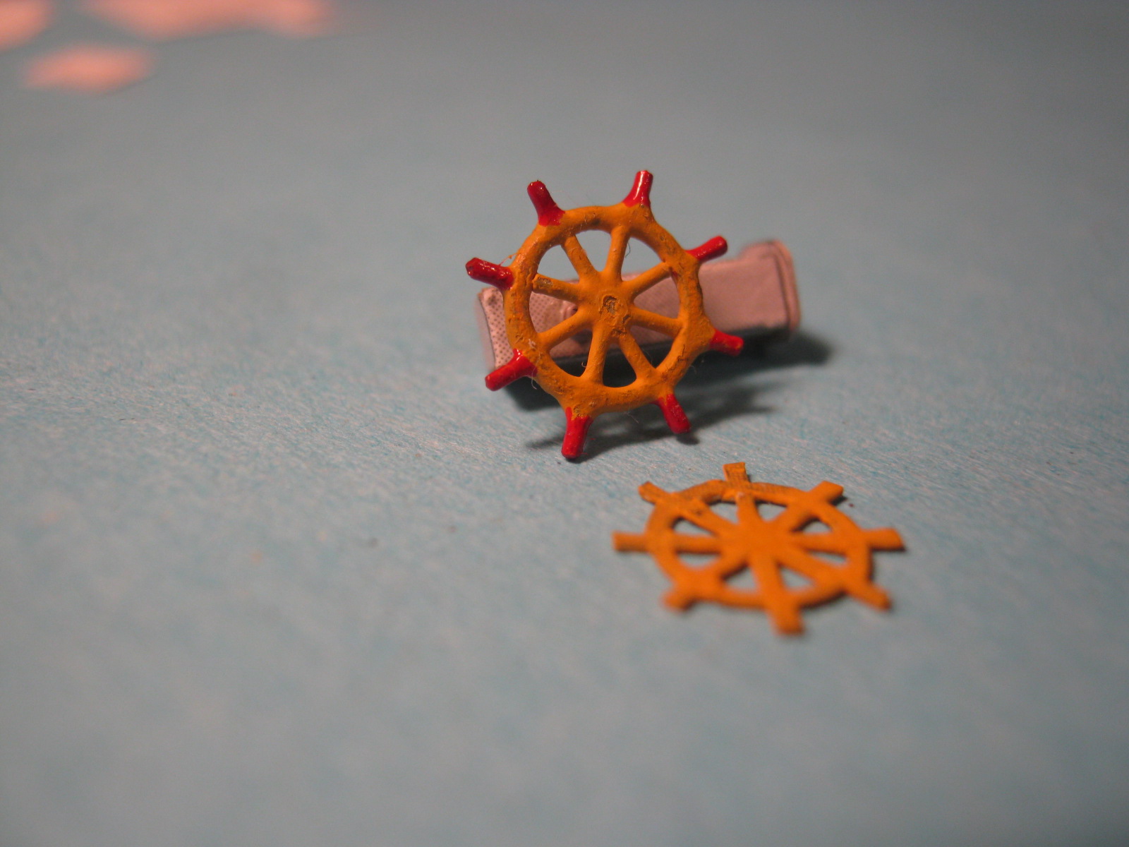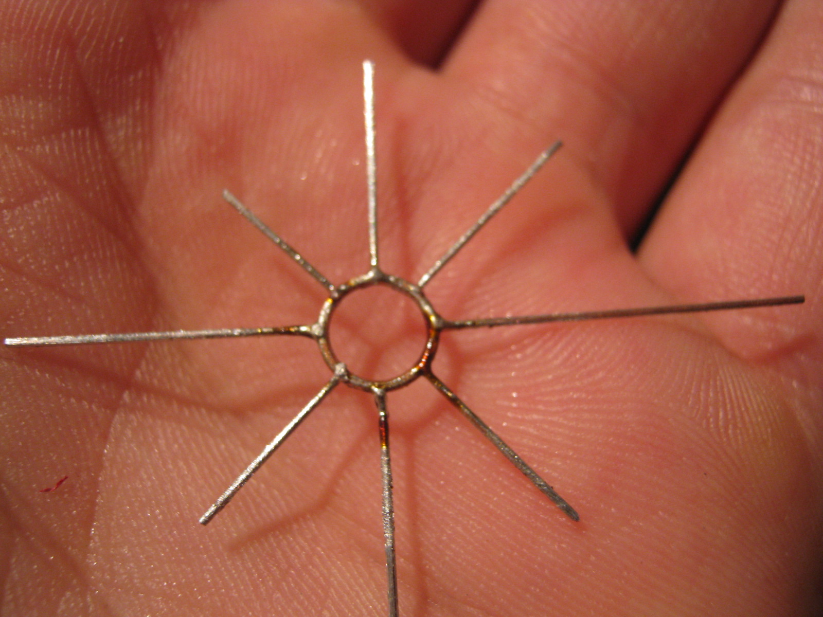 Pokazuję jak je wykonałem. Niestety się musiało zepsuć. Element wewnątrz koła jest już tylko wklejony na kropelkę i jak klej wyschnął to okazało się że się takie "grube spawy" na łączeniach porobiły więc wpadłem na genialny pomysł że na momencik nad zapalniczkę wsadzę, ponieważ sądziłem że szybciej spali się klej niż stopi cyna.... niestety było na odwrót. Luty się rozpuściły. Musiałem robić jeszcze raz.