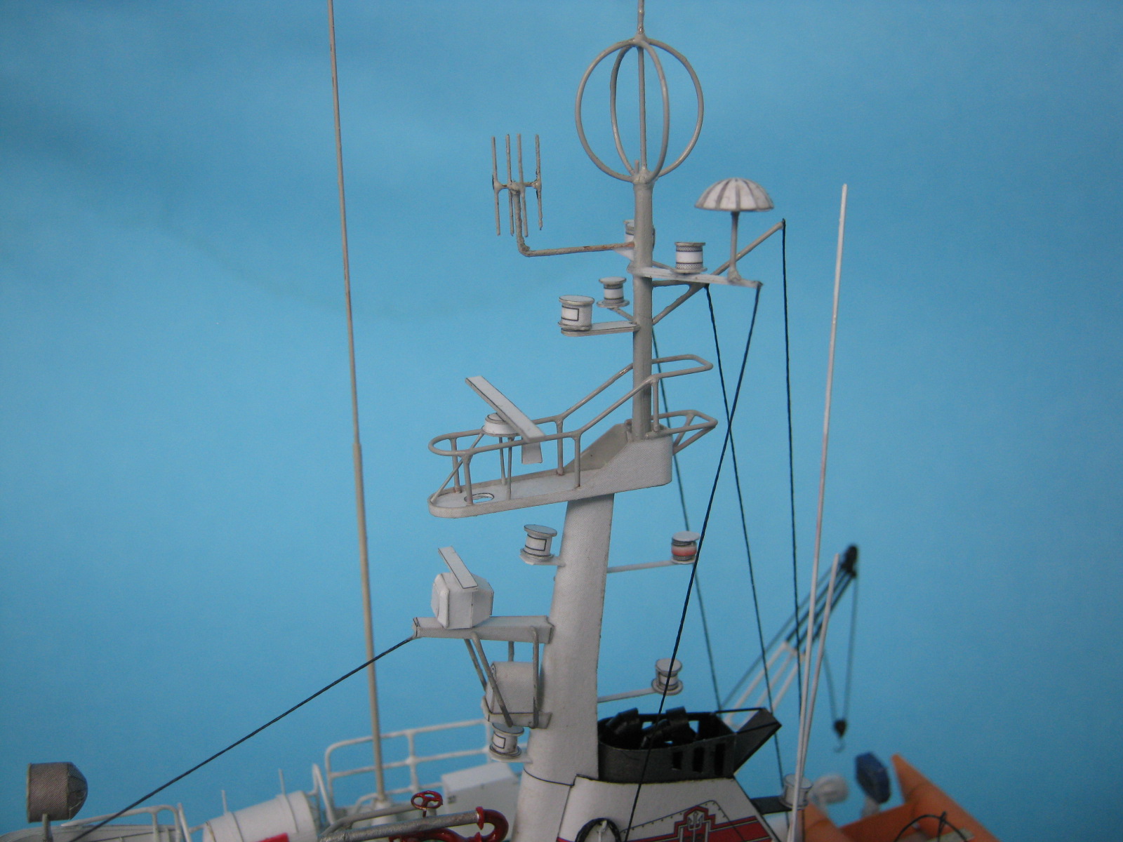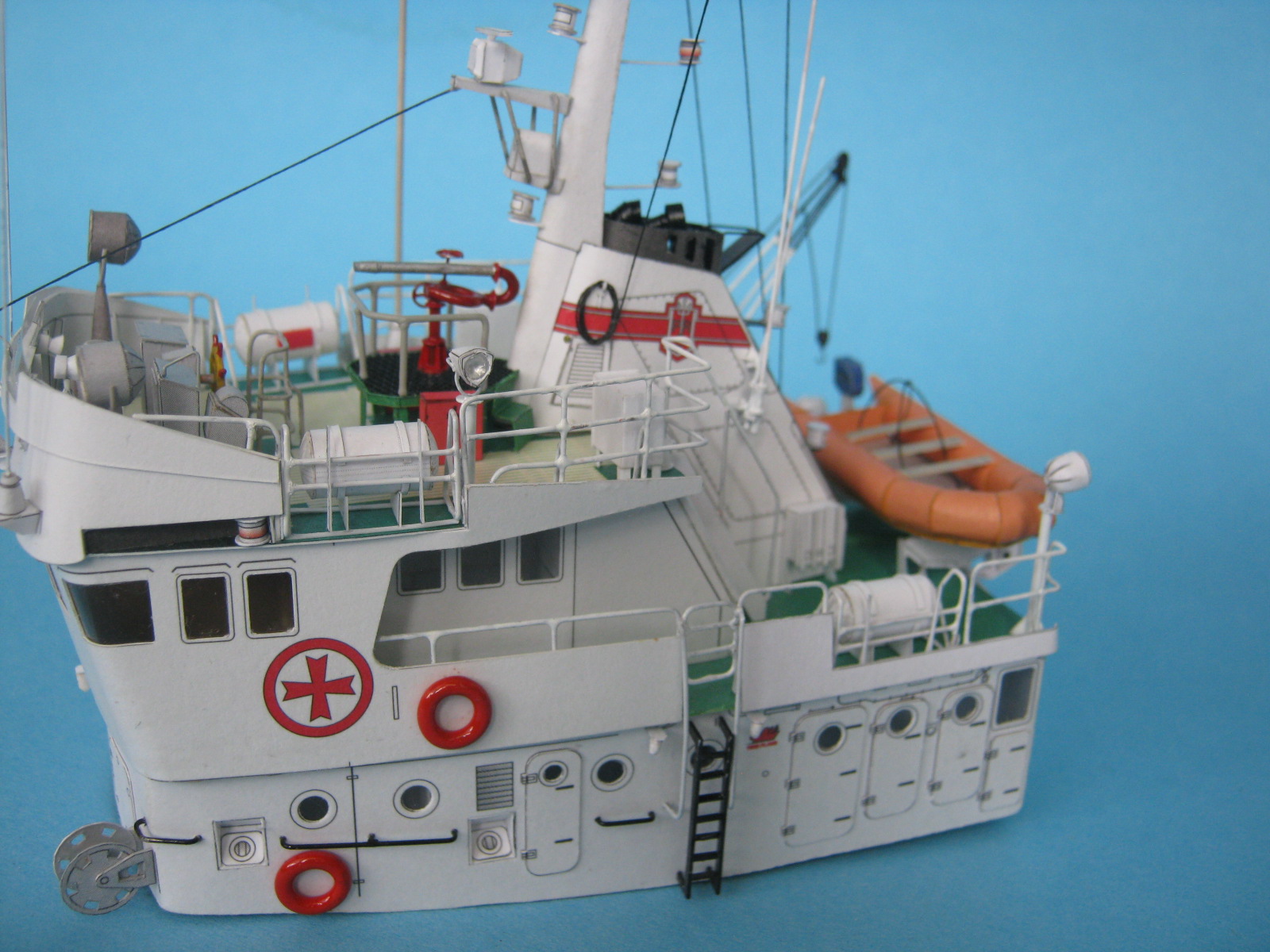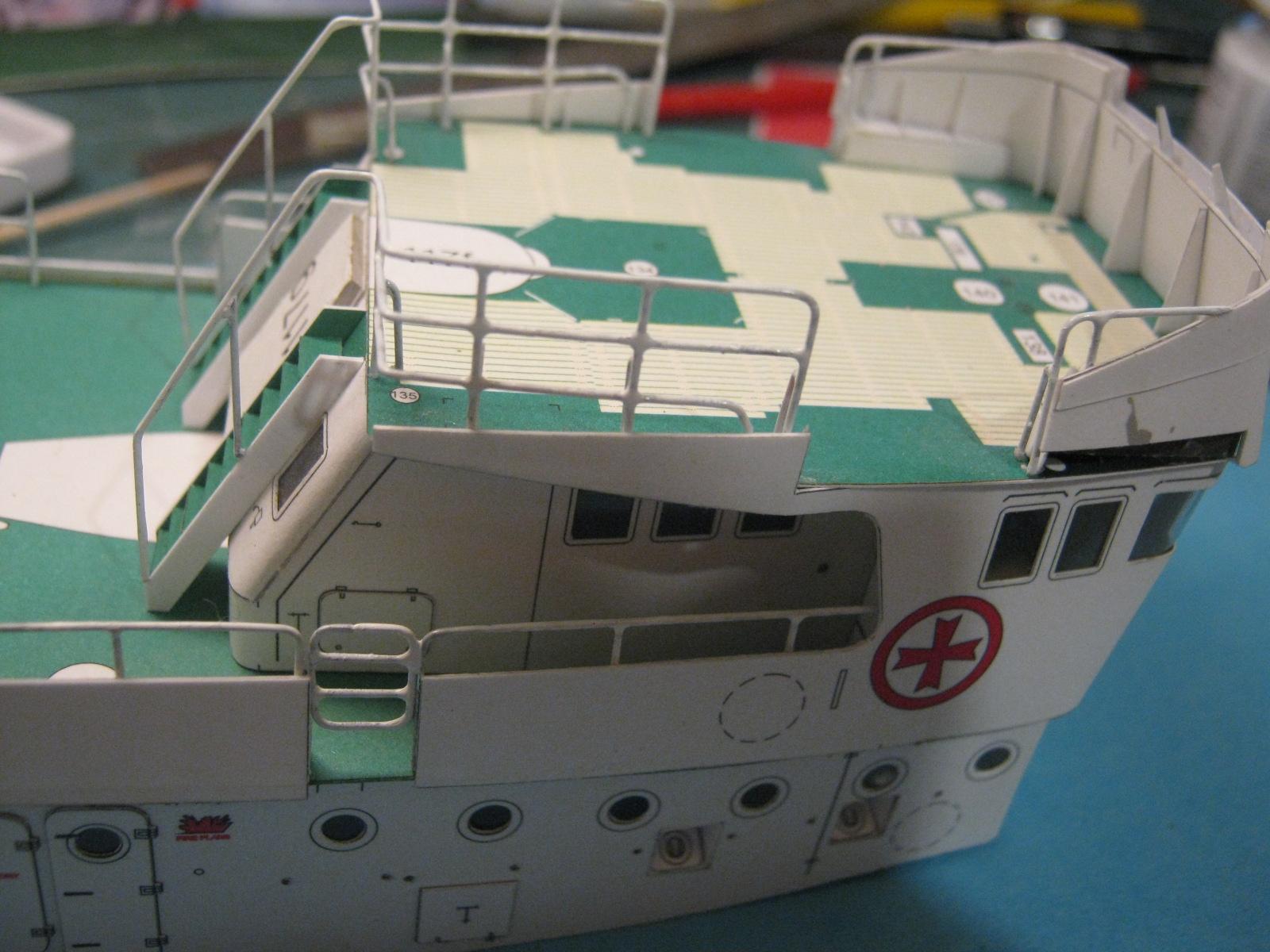 Przy próbie wykonania kół ratunkowych strasznie pogryzł mnie Dremel i była potrzeba założenia mi czterech szwów. Tymi to łapskami lepiłem do nadbudówki te relingi i barierki.