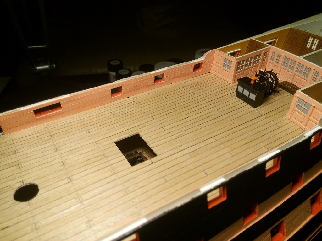 Tomek, a czy nie chciałoby Ci się poprawić tego ćwierćpokładu? Deski na pomostach biegnących nad wnęką, stanowiły przedłużenie tych układanych w dziobowej i rufowej części tego pokładu. U Ciebie wyszło to trochę takie poszatkowane. Może spróbowałbyś przynajmniej zgrać deskowanie na podestach z tym, które znajduje się przed i za wnęką?