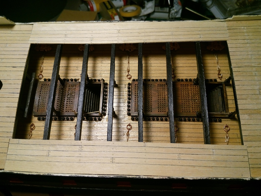 Tomek, a czy nie chciałoby Ci się poprawić tego ćwierćpokładu? Deski na pomostach biegnących nad wnęką, stanowiły przedłużenie tych układanych w dziobowej i rufowej części tego pokładu. U Ciebie wyszło to trochę takie poszatkowane. Może spróbowałbyś przynajmniej zgrać deskowanie na podestach z tym, które znajduje się przed i za wnęką?