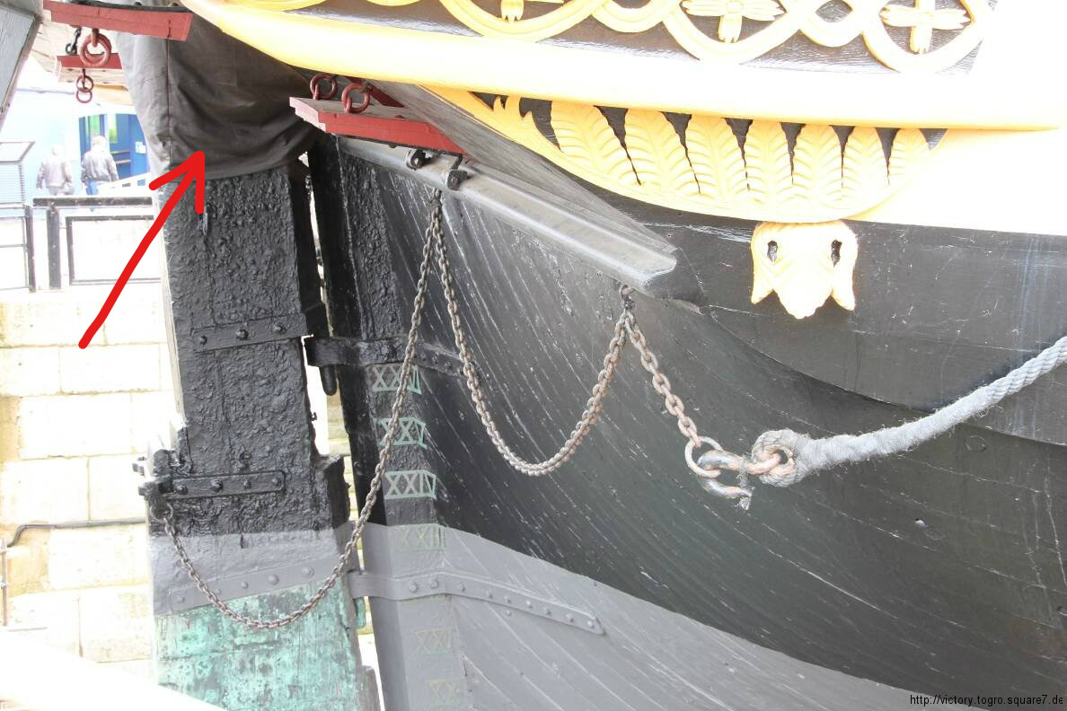 Na ty moim zdjeciu (fragment oryginalu) widac tez czesc przeciwleglej burty, gdzie miedzy schodami a dzialem widac pionowy pachol, wokol ktorego owiazywano koniec tej liny po jej przejsciu do wnetrza burty. Jest to wlasnie koncowka liny z zapytania, ktora przechodzi przez otwor w lawie talrepowej i dalej biegnie ku przodowi na tej lawie, by w koncu wejsc w drugi otwor w burcie (wyscielony olowiem) i tam jest owiazana na tym pachole.