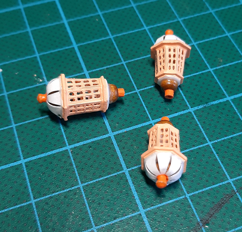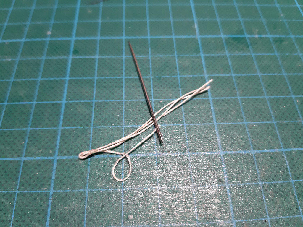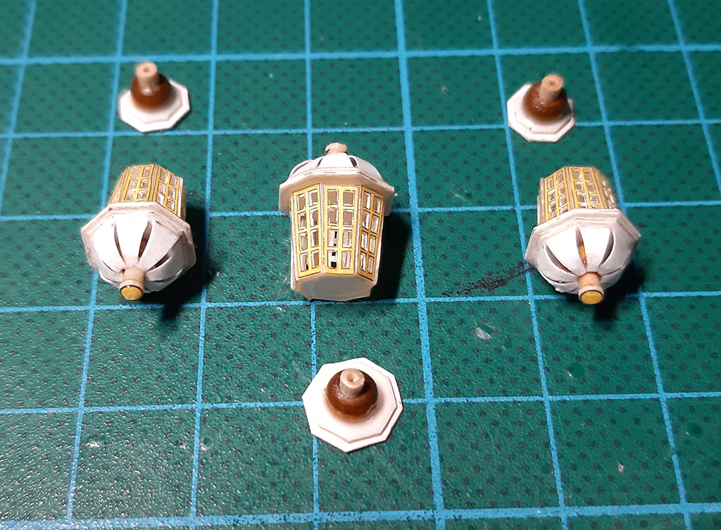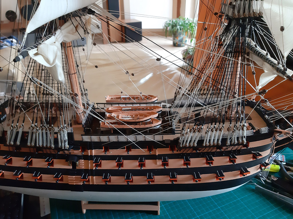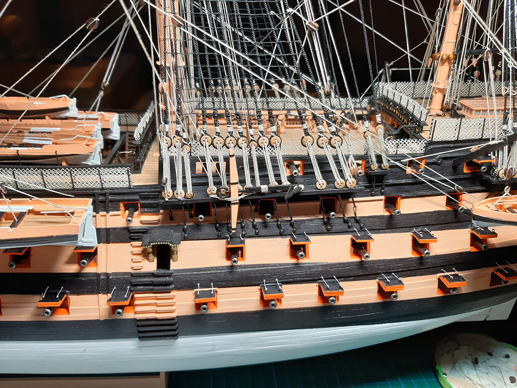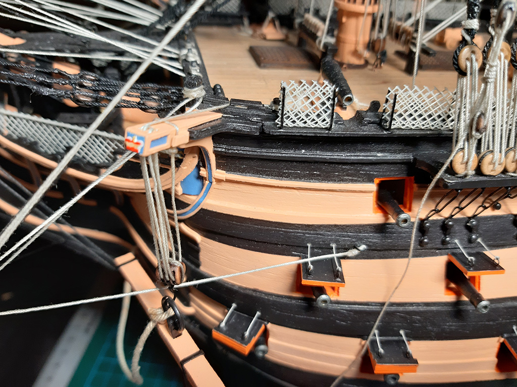 Nigdzie nie znalazłem zdjęcia, jak mocowano koniec liny z windy na wysięgniku, więc dorobiłem "oczojebne" knagi w kolorze furt armatnich i tak zakończyłem ten problem