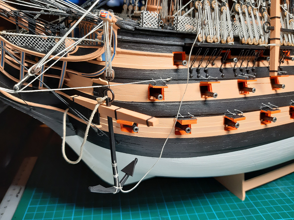 Nigdzie nie znalazłem zdjęcia, jak mocowano koniec liny z windy na wysięgniku, więc dorobiłem "oczojebne" knagi w kolorze furt armatnich i tak zakończyłem ten problem