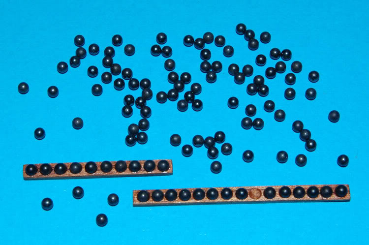 Przyszły też kule armatnie. Przyjąłem rozmiar 1,6mm. Jak na mój gust pasują idealnie (może tylko nie do karonady). Tylko jak ja te maleństwa teraz pomaluję... Jakieś propozycje szanowni Koledzy? Patynowanie odpada, próbowałem.