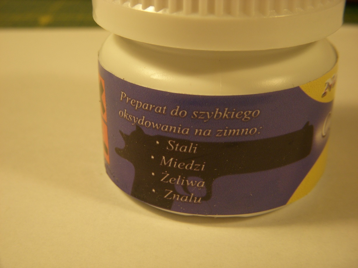 I jeszcze mam zaległą odpowiedź w temacie kul armatnich. Poniżej nie oksydowane i oksydowane (po wcześniejszym przeszlifowaniu). Zamieszczam też zdjęcie środka, którego użyłem. Sprawdzony w boju, działa.