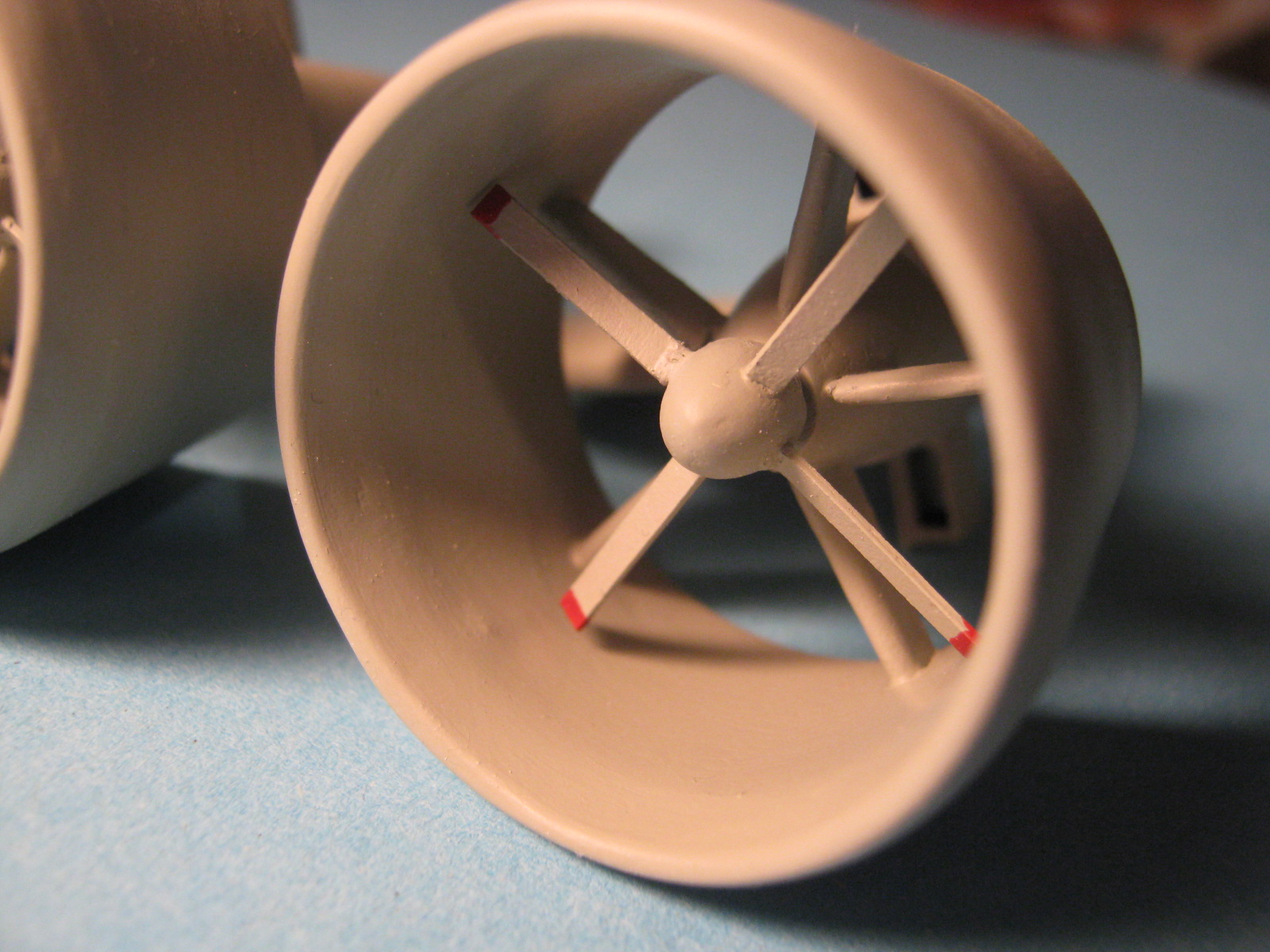 Skończyłem cały napęd. Muszę pomyśleć później nad malowaniem lub raczej kalkomanią. Na obudowach śmigieł są namalowane flagi Grecji, na kadłubie numery itp. Myślałem o wydrukowaniu na kolorowej drukarce na jakimś cienkim papierze ale wydaje mi się że może to być zbyt ordynarnie widoczne. Ktoś może dać namiary gdzie mi takie kalkomanie zrobią?