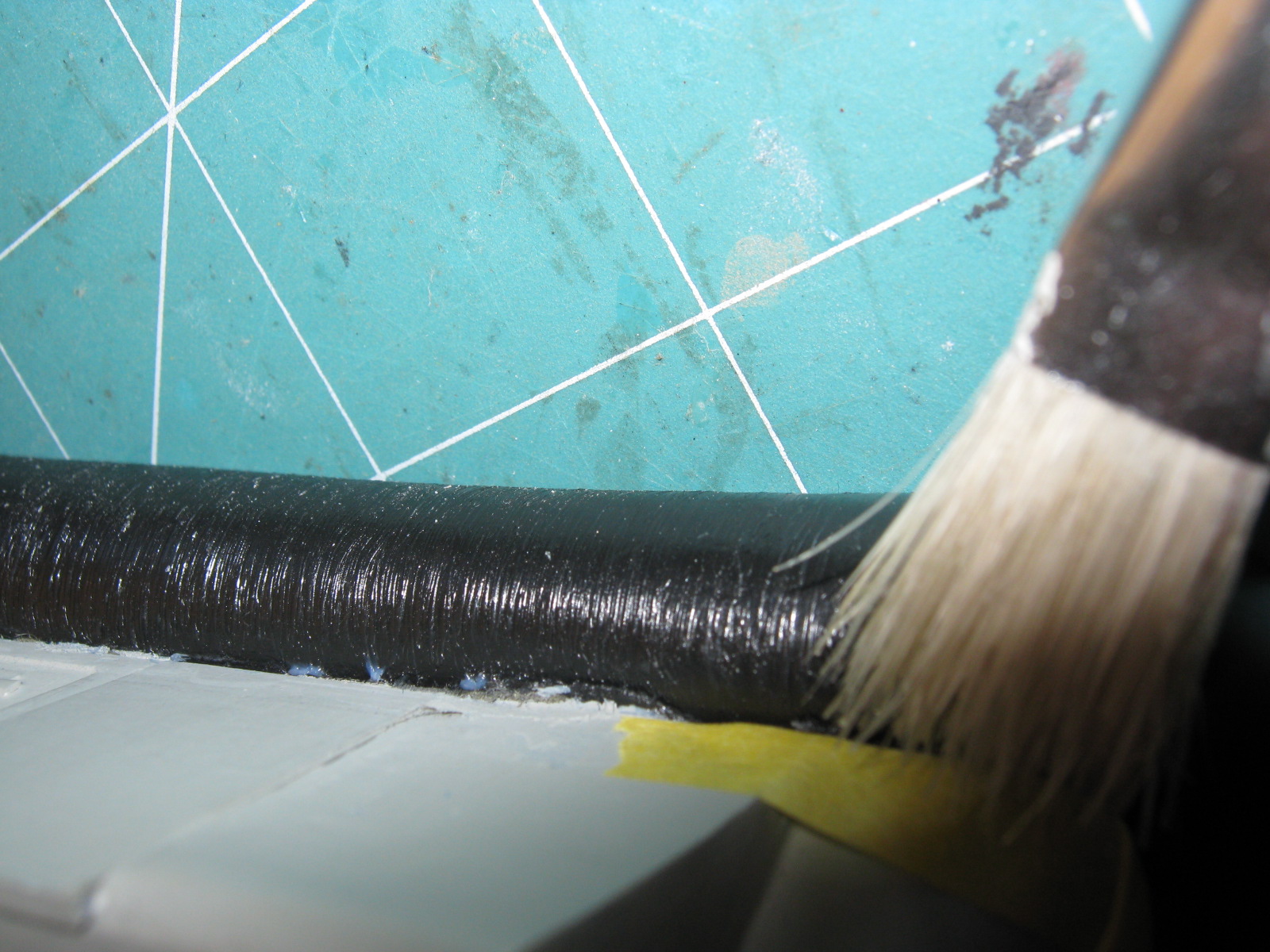 Żeby guma płaszcza się nie świeciła jak psu jajca to trochę ją przerobiłem. Twardym pędzlem naniosłem klej do drewna Pattexx ale mam taki klej o konsystencji smalcu, powstały takie fajne nierówności. Całość pokryłem matowym czarnym Humbrolem. Myślę, że teraz to lepiej wygląda.