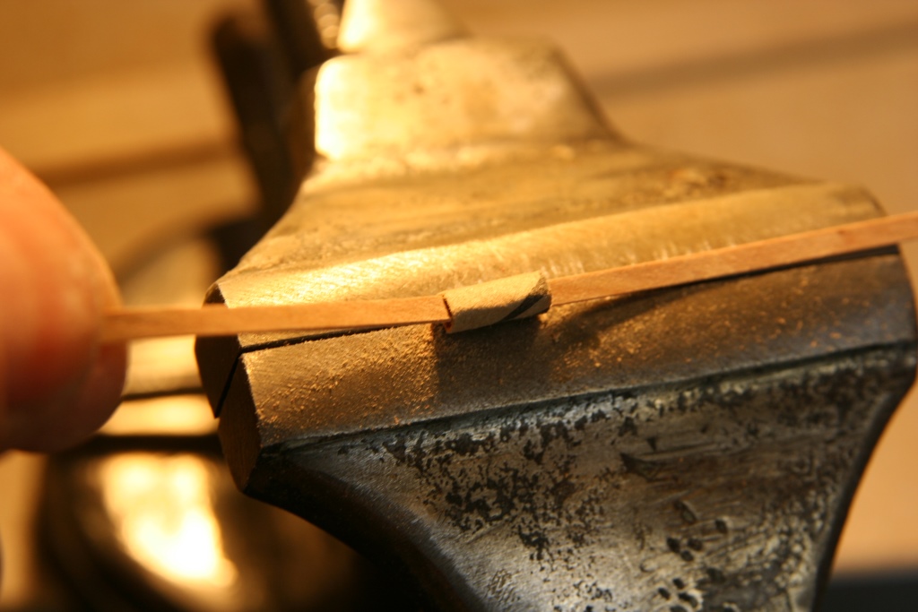 Poszycie burt wykonane z czerśni. Wszystkie planki ciąłem na prosto przy linijce. Ze względu na niewielką szerokość 2,5-3mm dało się całkiem nieźle dogiąć a tam gdzie naprężenia były zbyt duże rozcinałem w miejscach, które zakryte będą wzmocnieniami pionowymi. Fornir przeszlifowany jeszcze przed cięciem a następnie krawędzie pasków załamane tak aby uzyskać efekt widocznych planek. Do załamania krawędzi prosty i skuteczny patent przeciągnięcia paska przez oczko z papieru ściernego widoczny na zdjęciu.