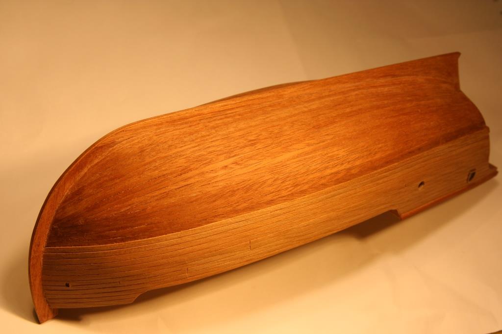 Kil zamocowany. Pogrubiony karton oklejony fornirem z obu stron. Wstępnie zostawiłem ok 2mm naddatku po zewnętrzej stronie i dopiero po dopasowaniu wewnętrznej strony do kadłuba i przyklejeniu zeszlifowałem naddatek do wymaganego wymiaru. Na koniec zamknięcie paskiem forniru.