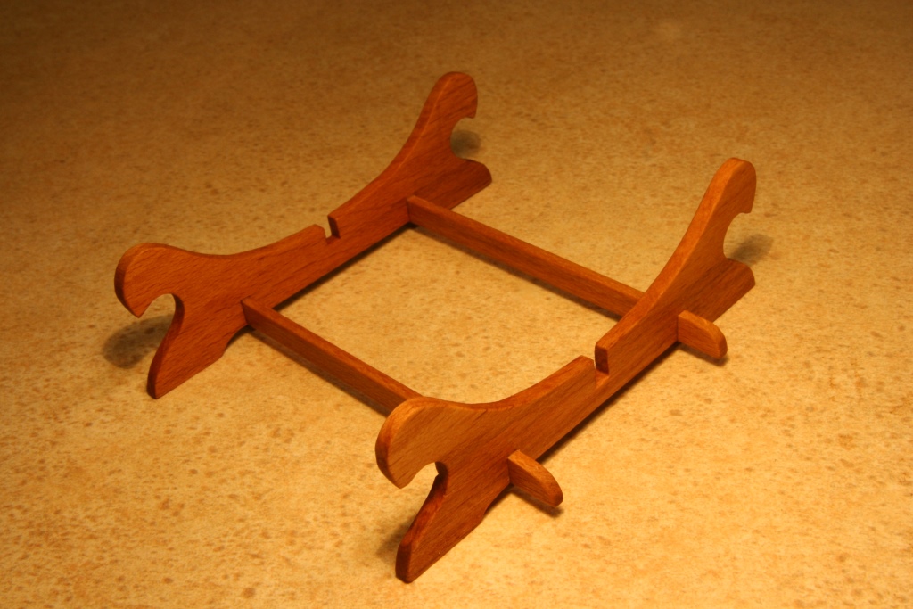 Powoli zaczną się prace na pokładzie więc myślę, że dobry moment na wykonanie podstawki. Drewno bukowe, po odrysowaniu kształtu większość wyszlifowana na szlifierce tarczowej natomiast wewnętrzny mały łuk za pomocą wiertarki z "patykiem szlifierskim" wykonanym z kołka bukowego 8mm oklejonego paskiem papieru gr120 (pokazany na zdj.). Wycinanie piłką włosową trwałoby kilka razy dłużej.