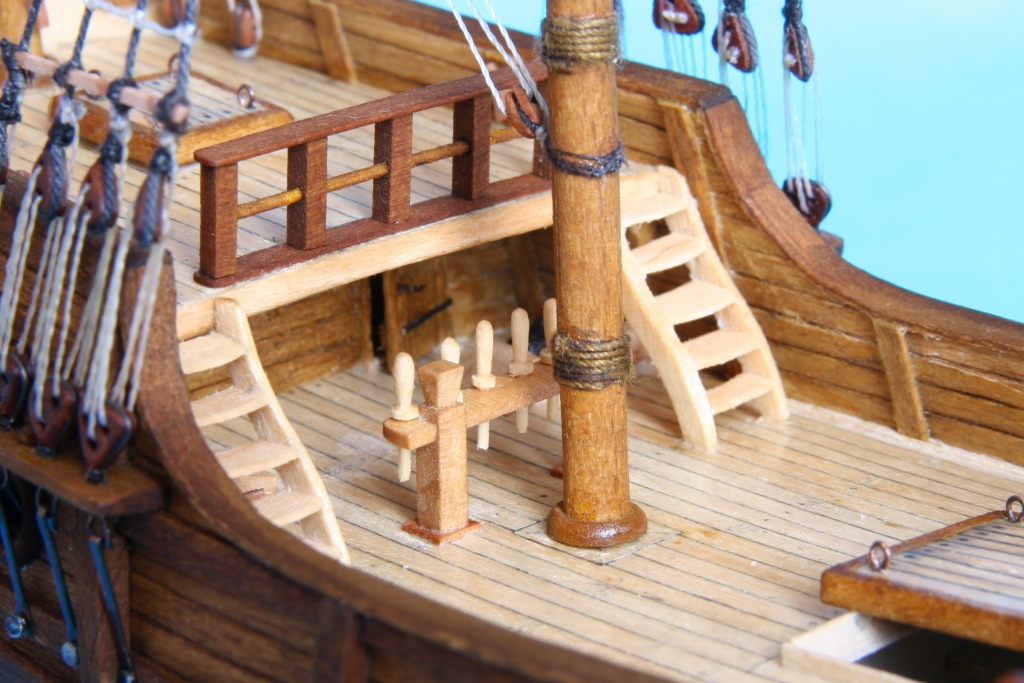 Trochę drobnych detali jak obręcze wokół masztów, otworów pod liny kotwiczne, bloki na topach masztów, knagi na burtach i takie czarne ustrojstwo, które nie mam pojęcia do czego służyło.
