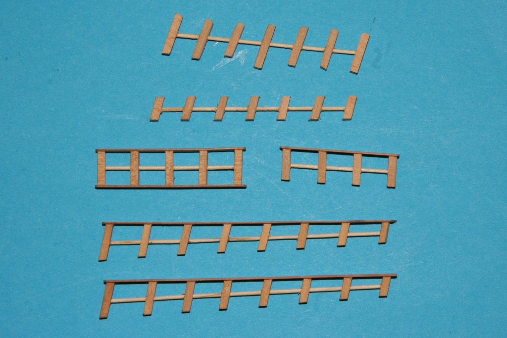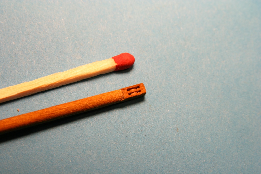 Przygotowane barierki wokół pokładów. Na razie poczekają na wklejenie, aż do momentu zamocowania masztów i olinowania, bo pewnie nie raz bym je wyłamał. Nie mam ścierarki, ale do wyszlifowania równych i tej samej grubości kołeczków sprawdza się patent, który już gdzieś widziałem na forum. Przeszlifowanie z patyka szaszłykowego na niespełna 1mm średnicy to dosłownie chwila.