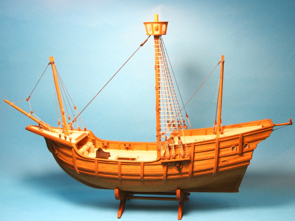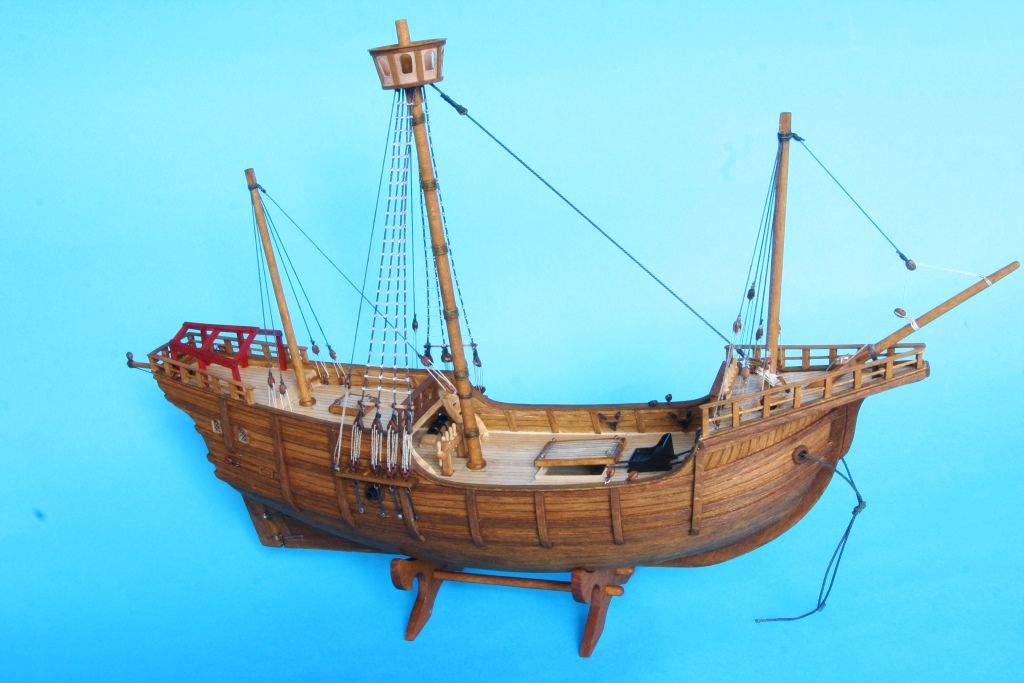 Kolejne elementy wykonane i zamontowane na swoih miejscach. Ster oraz kołkownice. Jako że na burtach nic już nie będzie doklejane pociągnałem je olejem 3v3 . Na pokładzie tylko pokrywę luku i dobrze, że tylko pokrywę. Okazało się, że pod wpływem oleju rozmazał się trochę marker imitujący kołkowanie pokładu i uszczelnienia pomiędzy deskami. W Pincie robiłem tak samo i wszystko wyszło ok. Z jednym szczegółem, marker permanentny i tu i tam tyle, że z dwóch różnych firm. Nauka na przyszłość - zawsze robić test. Ostatecznie pokład pociągnąłem lakierem akrylowym. Na teraz tak to już wygląda :