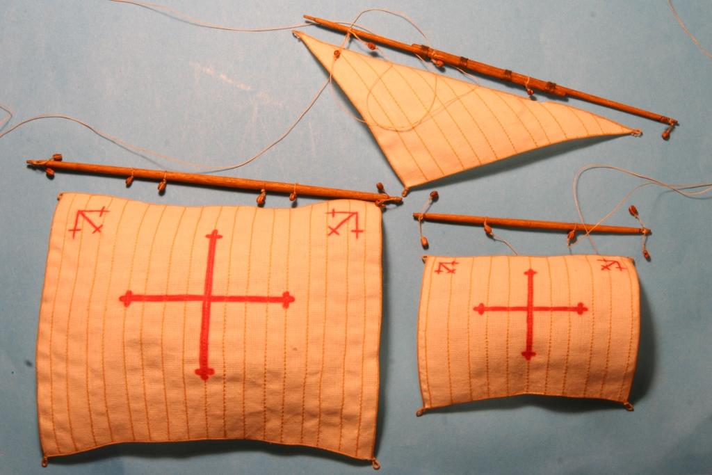 Żagle uszyte, krzyże namalowane zwykłym czerwonym długopisem, przesmarowane rozwodnionym patexem i wyprofilowane. Na rejach zamocowane bloczki. Teraz czas to poskładać razem i zawieszać :)