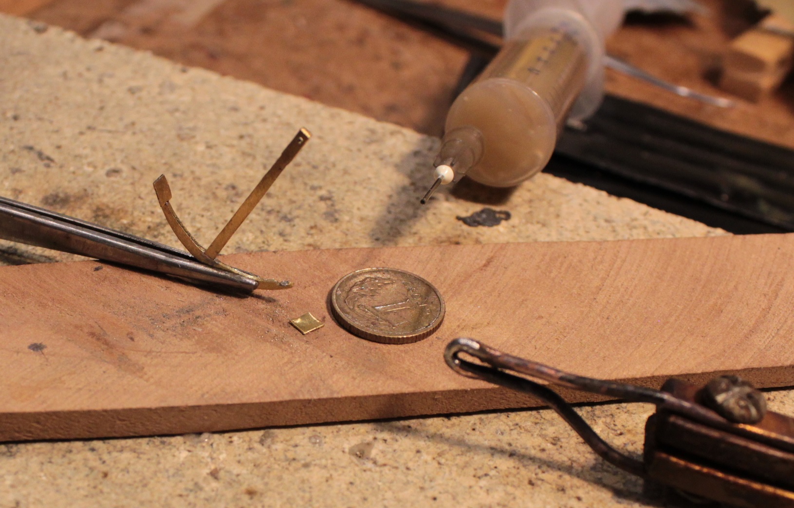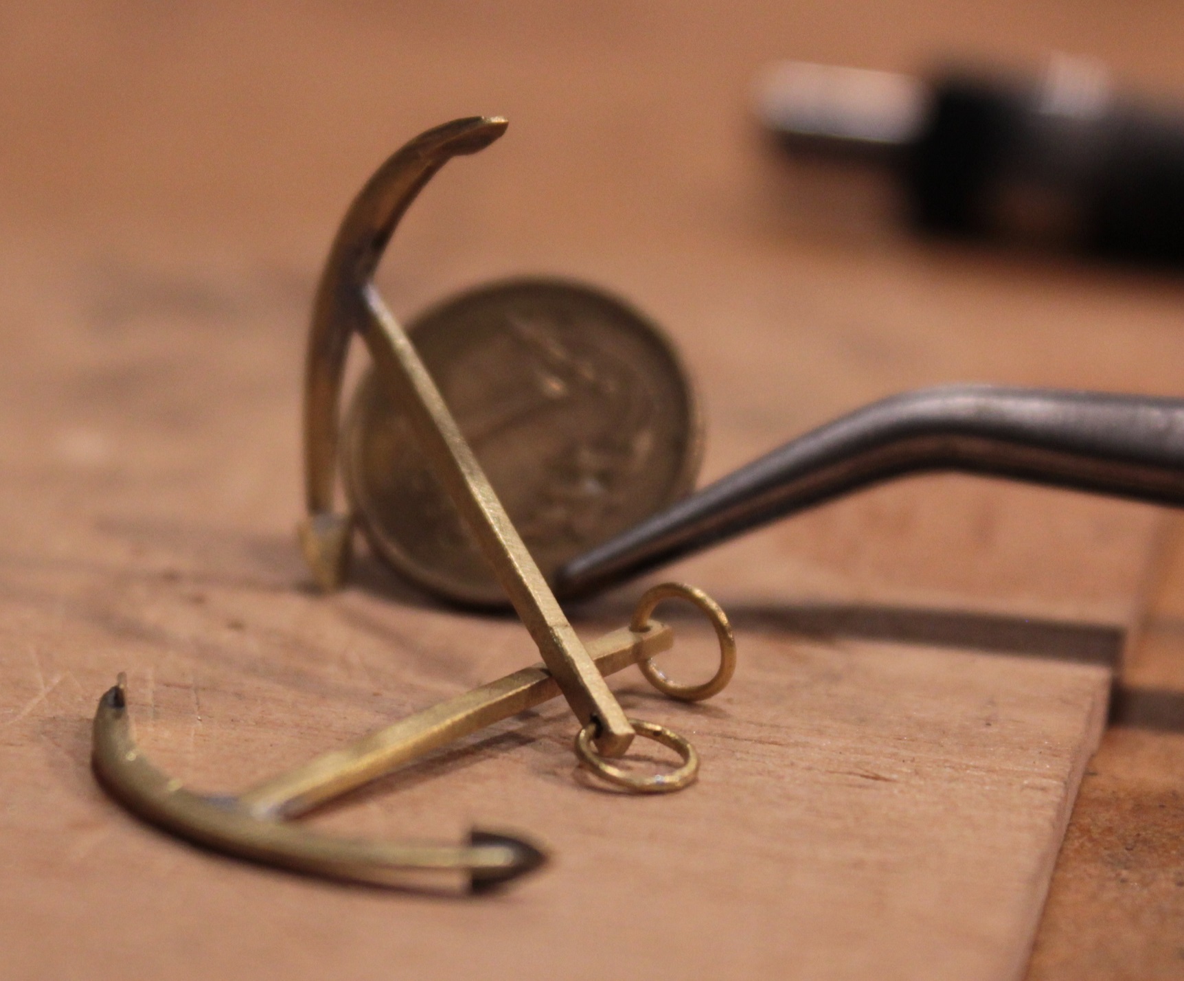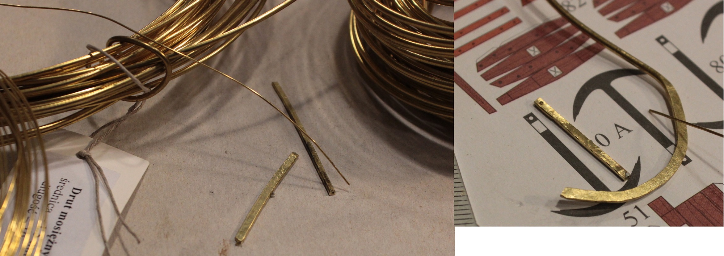 Pozazdrościłem pięknych kotwic z Alerta Piotrka, no i zrobiłem swoje dużo mniej piękne dwie kotwice. Z braku tak grubej mosiężnej blachy podstawowe elementy odkułem z drutu mosiężnego (1,6 mm i 1,2 mm), łapy to blaszka 0,25 mm.