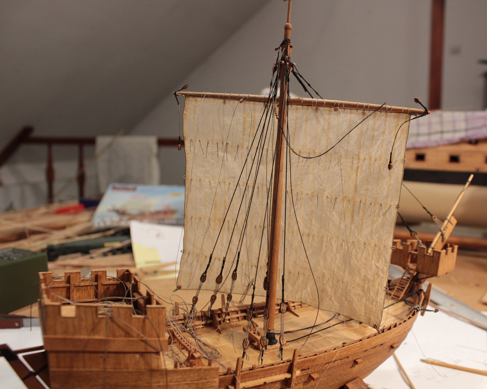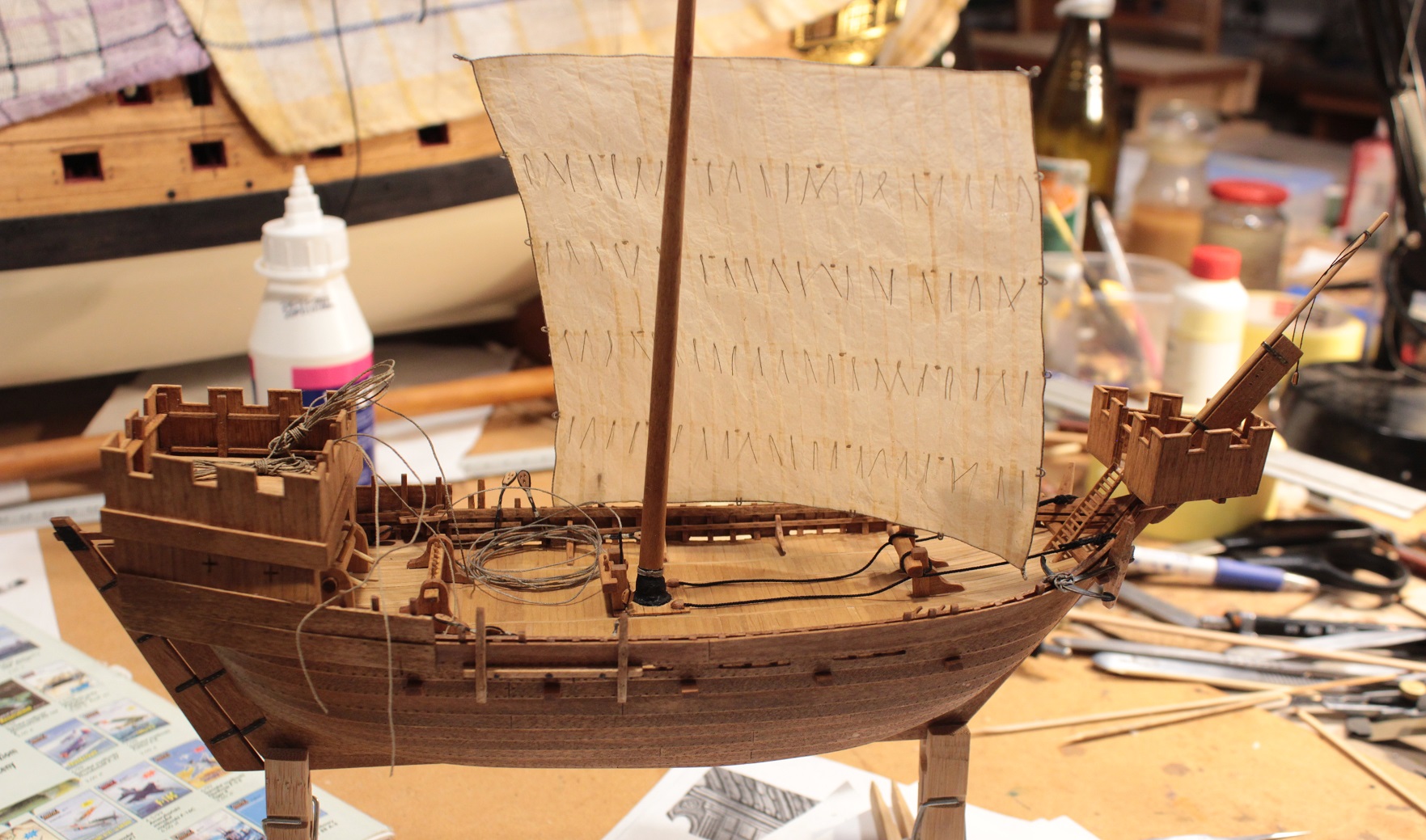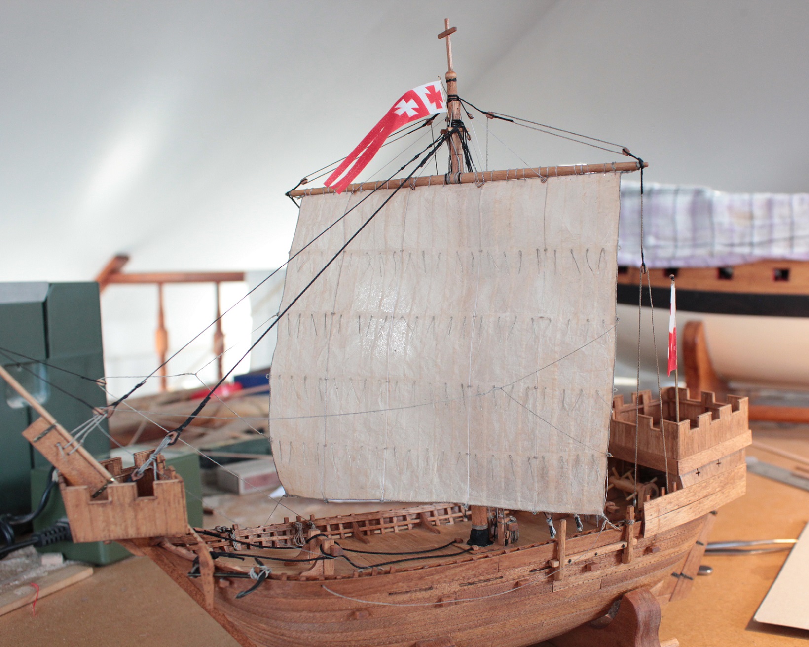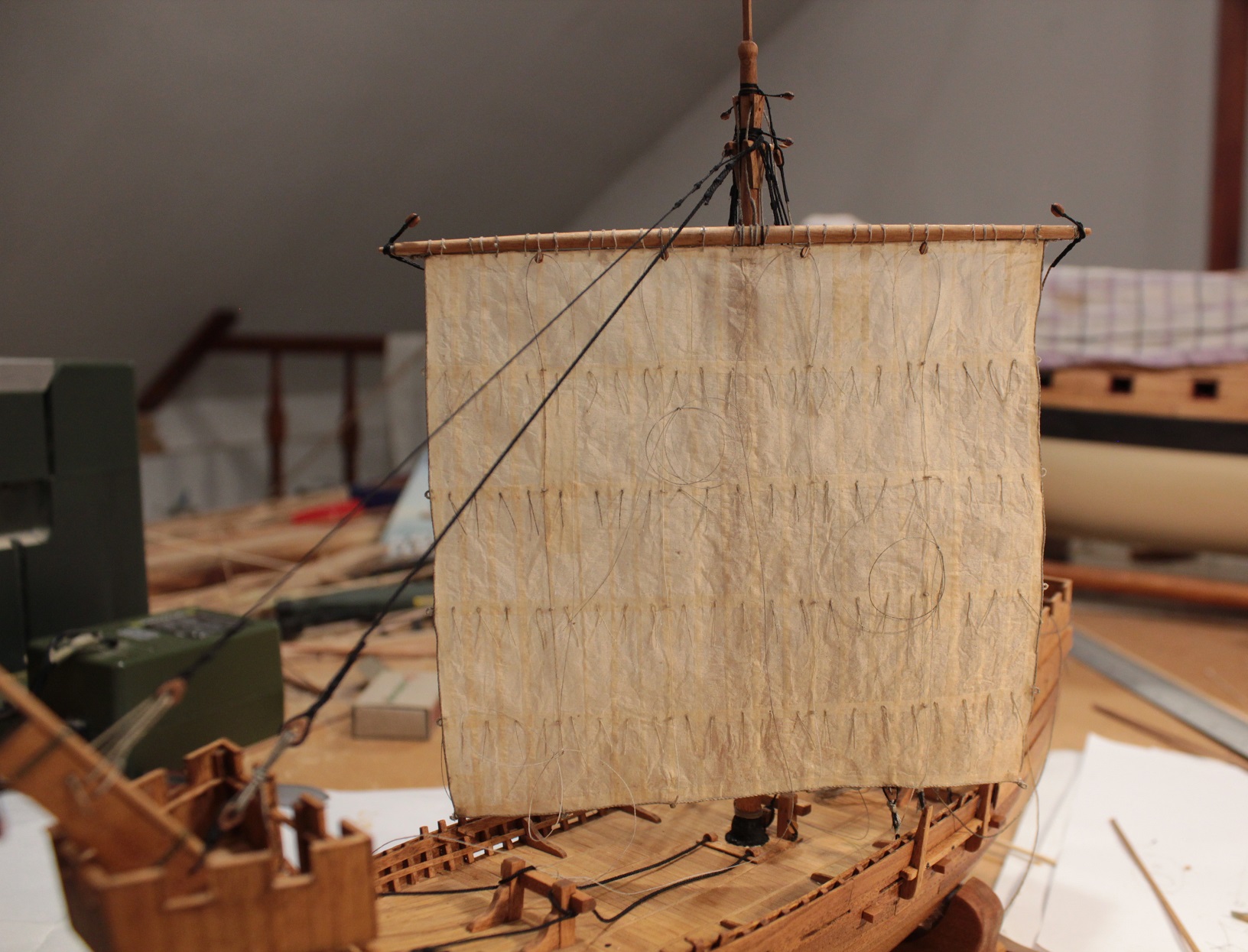 Kotwice podwiesiłem, żagiel też mam gotowy. Żagiel zrobiłem na tych samych zasadach co mikromodelarze, ale brytów nie rysowałem, tylko sklejałem jeden na drugi.