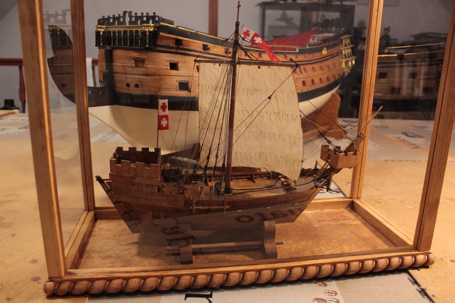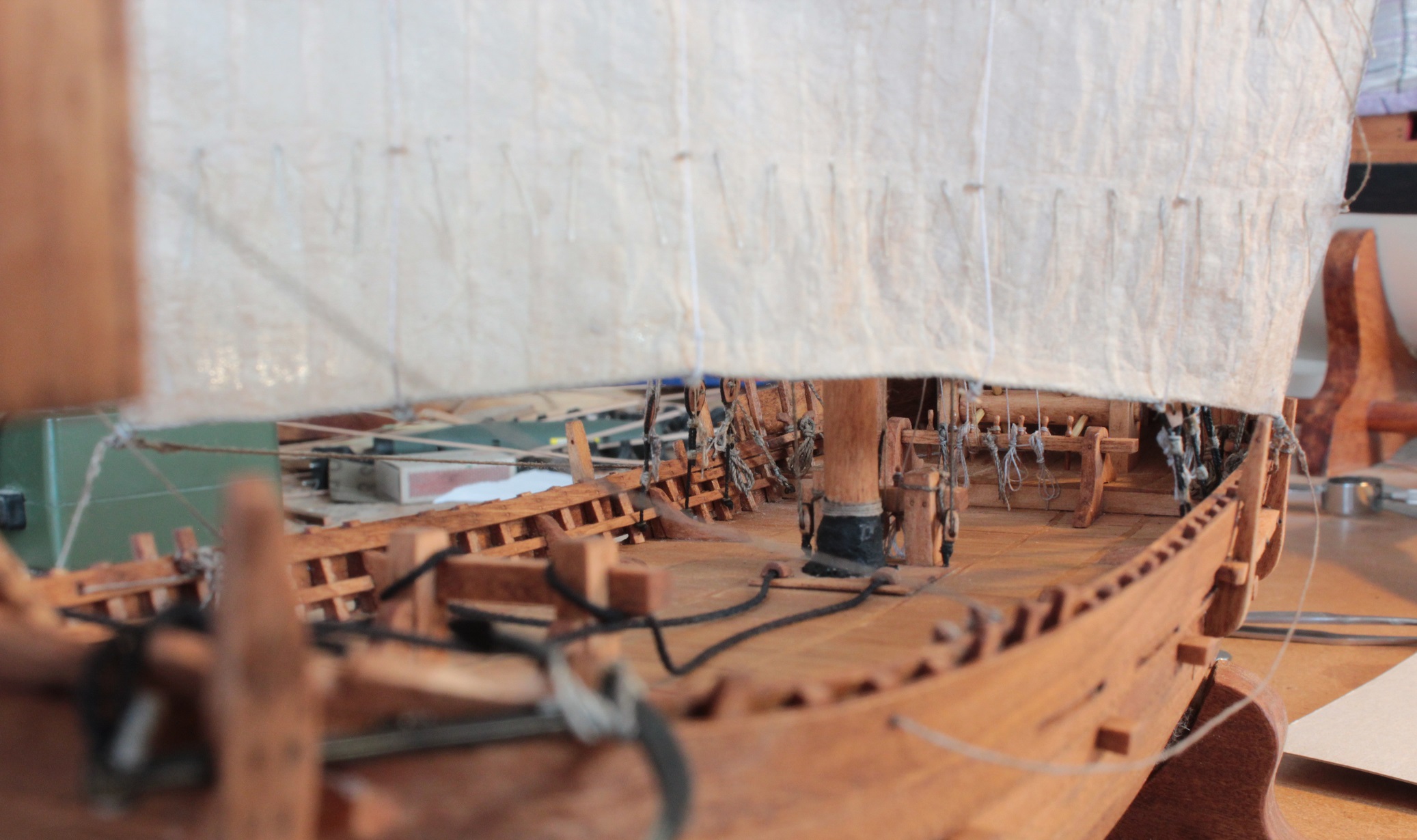 Widok na pokładowy klar Żagiel ustawiłem kurs prawym halsem Widok na lewa burtę Mocowanie do gablotki ... i już w sarkofagu Kogę skończyłem w czwartek (to jest 28 stycznia 2021), a dziś skończyłem gablotkę.