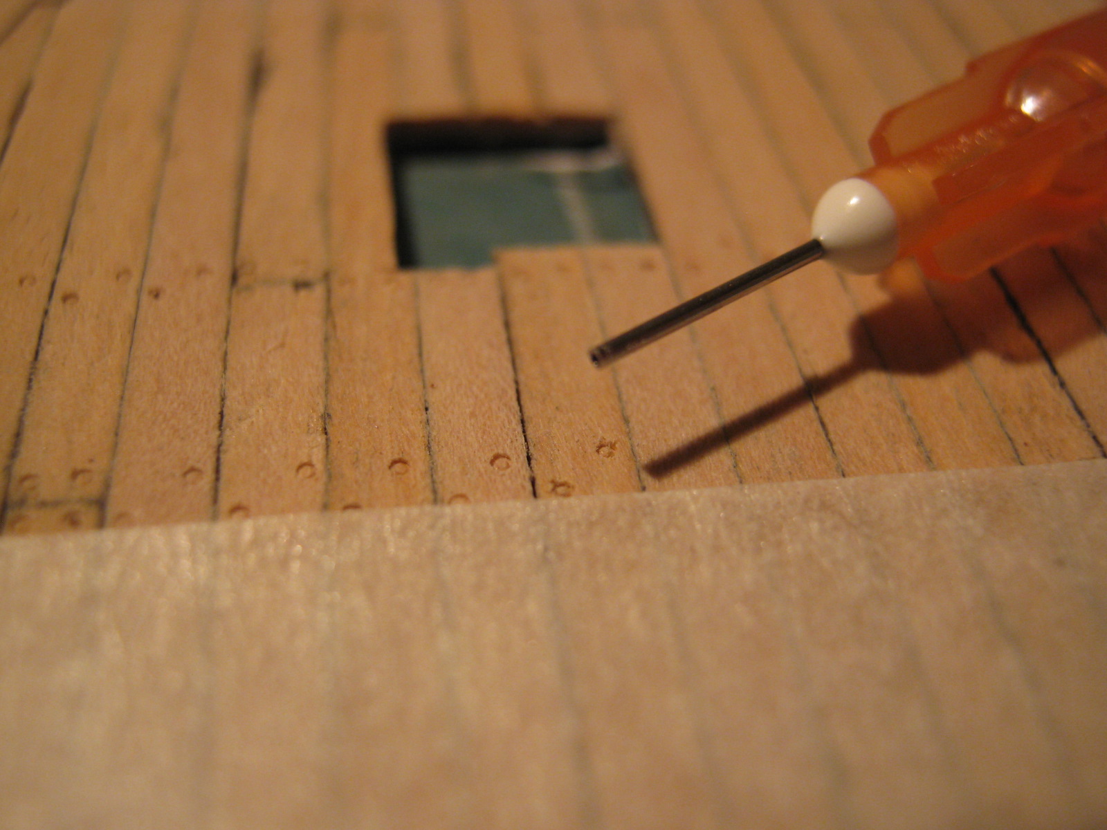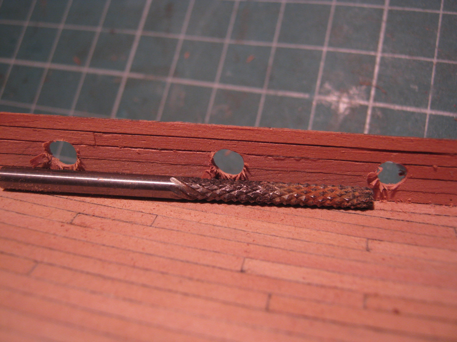 Zrobiłem poszycie nadburcia i wyszlifowałem sobie otwory strzelnicze. Idealne doszlifowanie otworów nastąpi po przyklejeniu poszycia burtowego zewnętrznego.