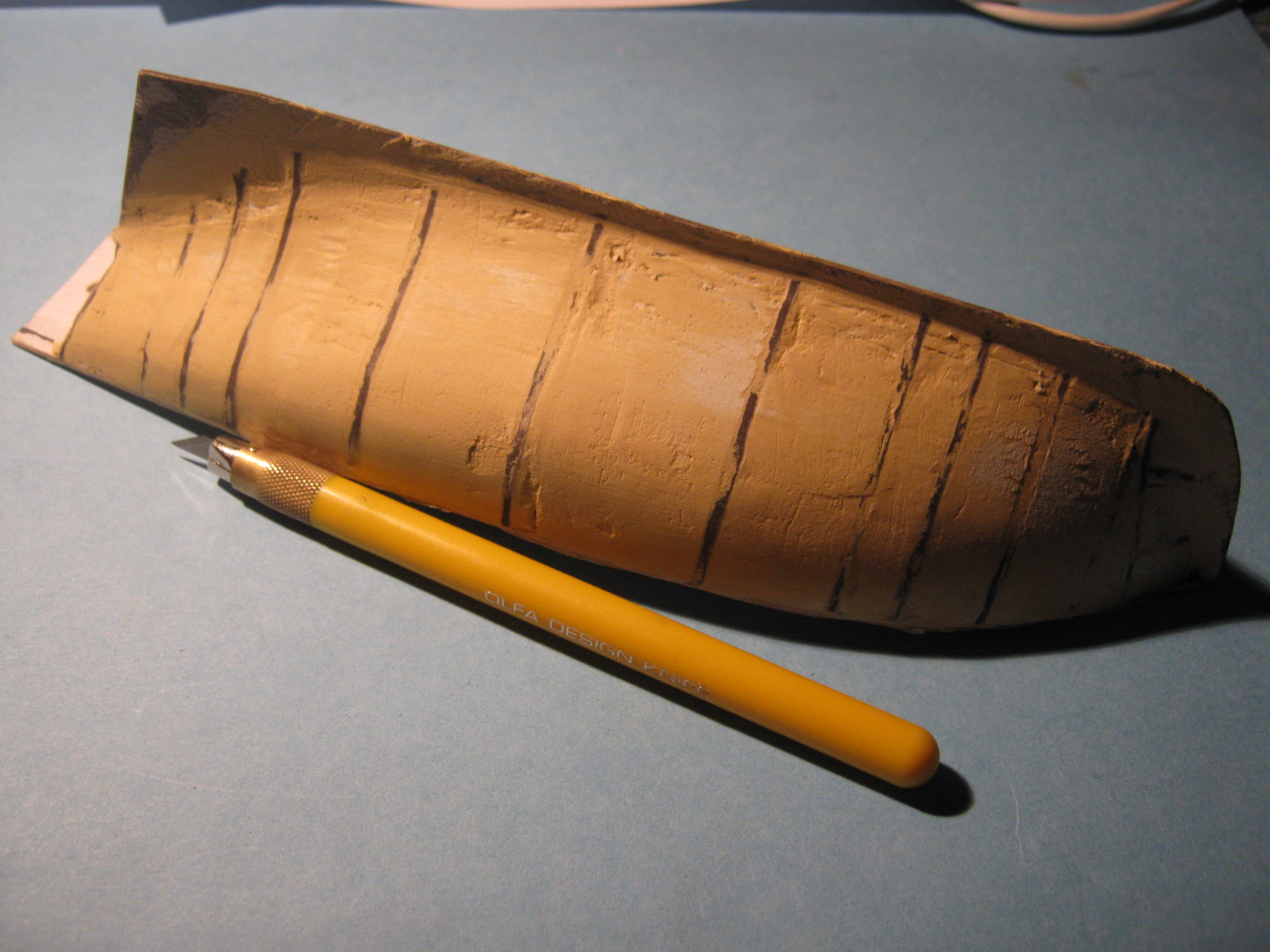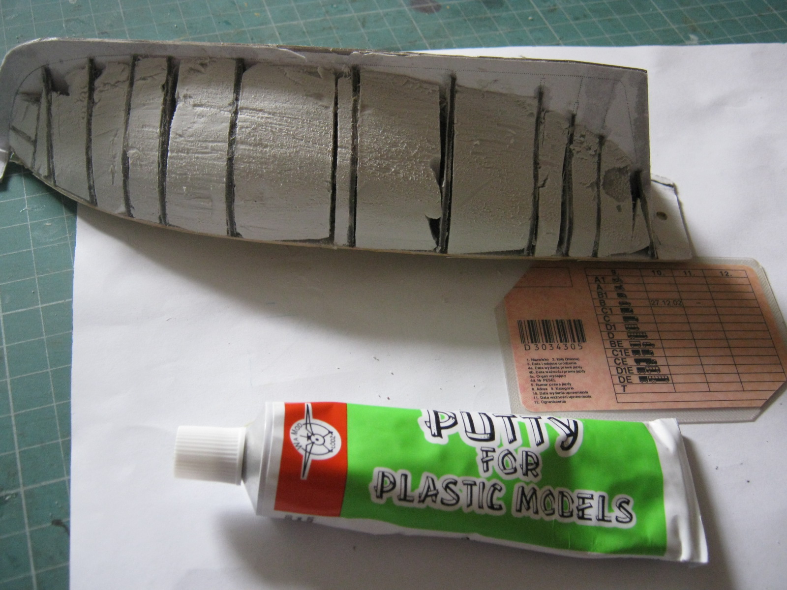 [EDIT]: Nie mogłem kłaść szpachlówki Wamod bezpośrednio na piankę bo szpachlówka ją wyżerała. Na piankę najpierw szła szpachla do drewna, później po oszlifowaniu szpachli warstwa rozrzedzonego wikolu, na to papierowe pierwsze poszycie z wycinanki, które później nasączyłem superglue a na sam koniec na dopieszczenie szpachlówka wamodu.