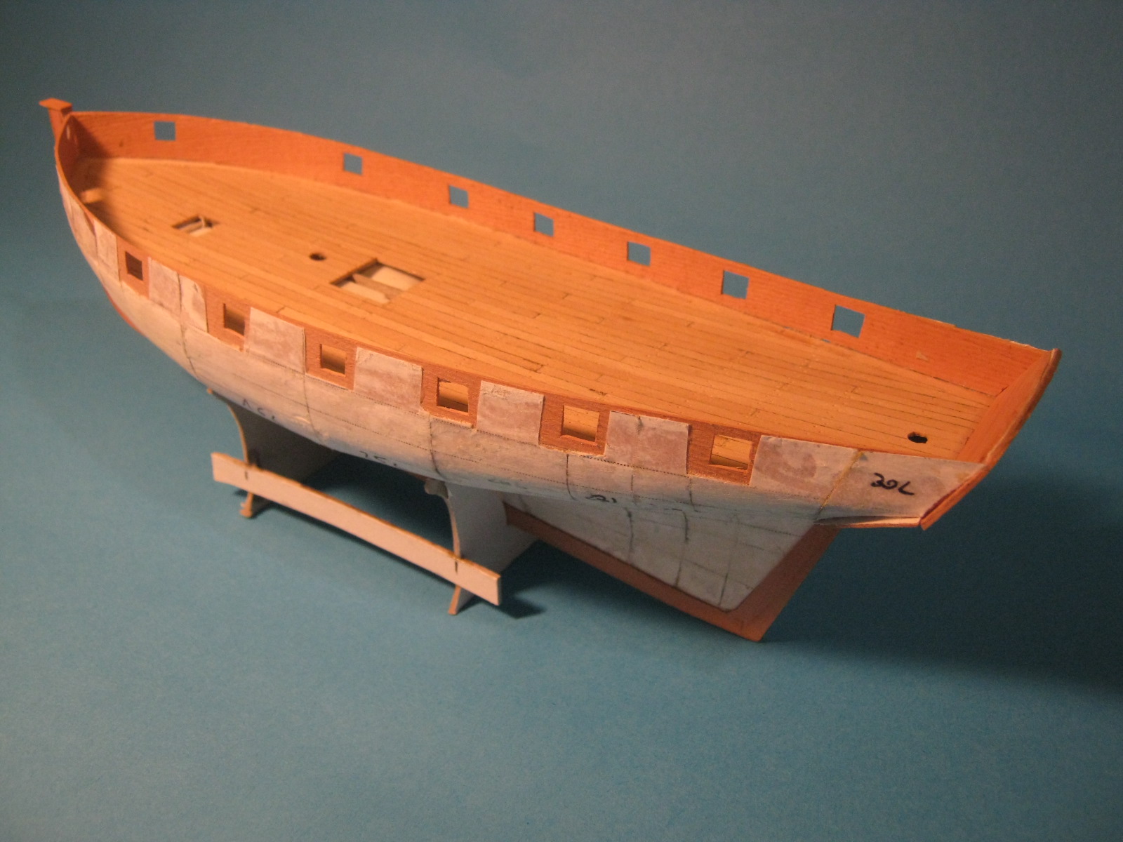 Zrobiłem też galerię rufową i stępkę z imitacją łączenia poszczególnych elementów.
