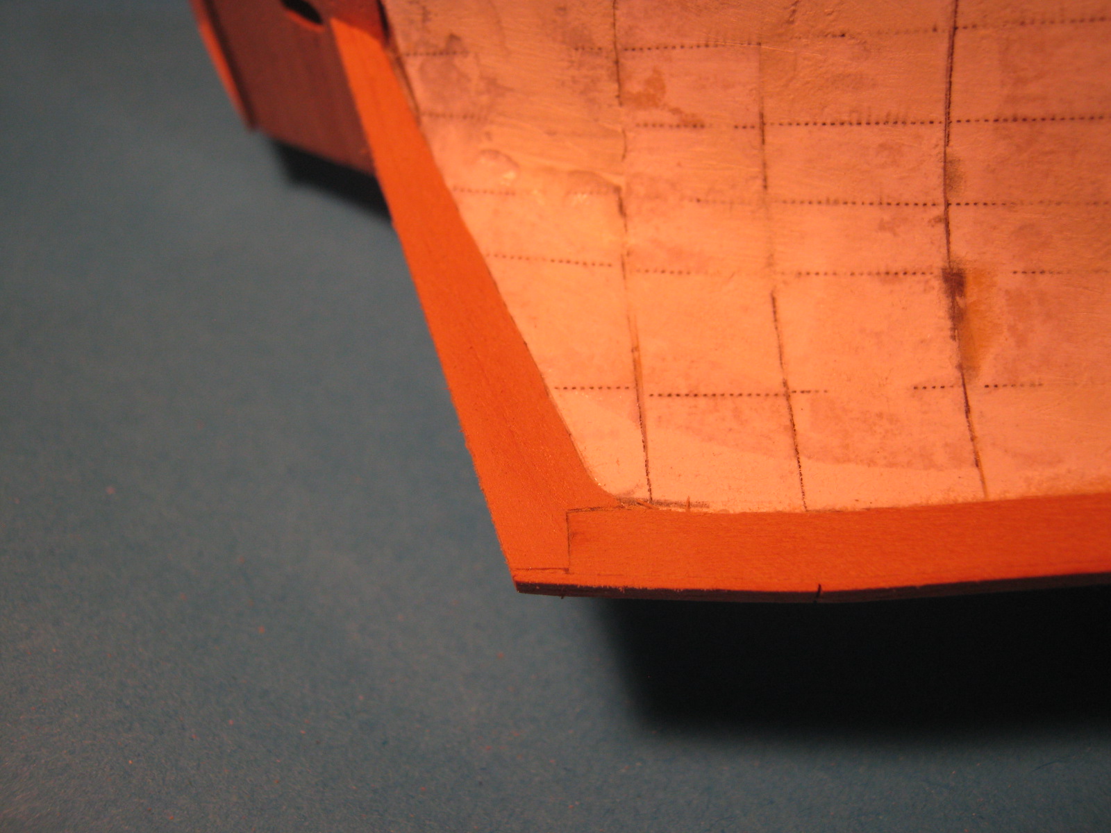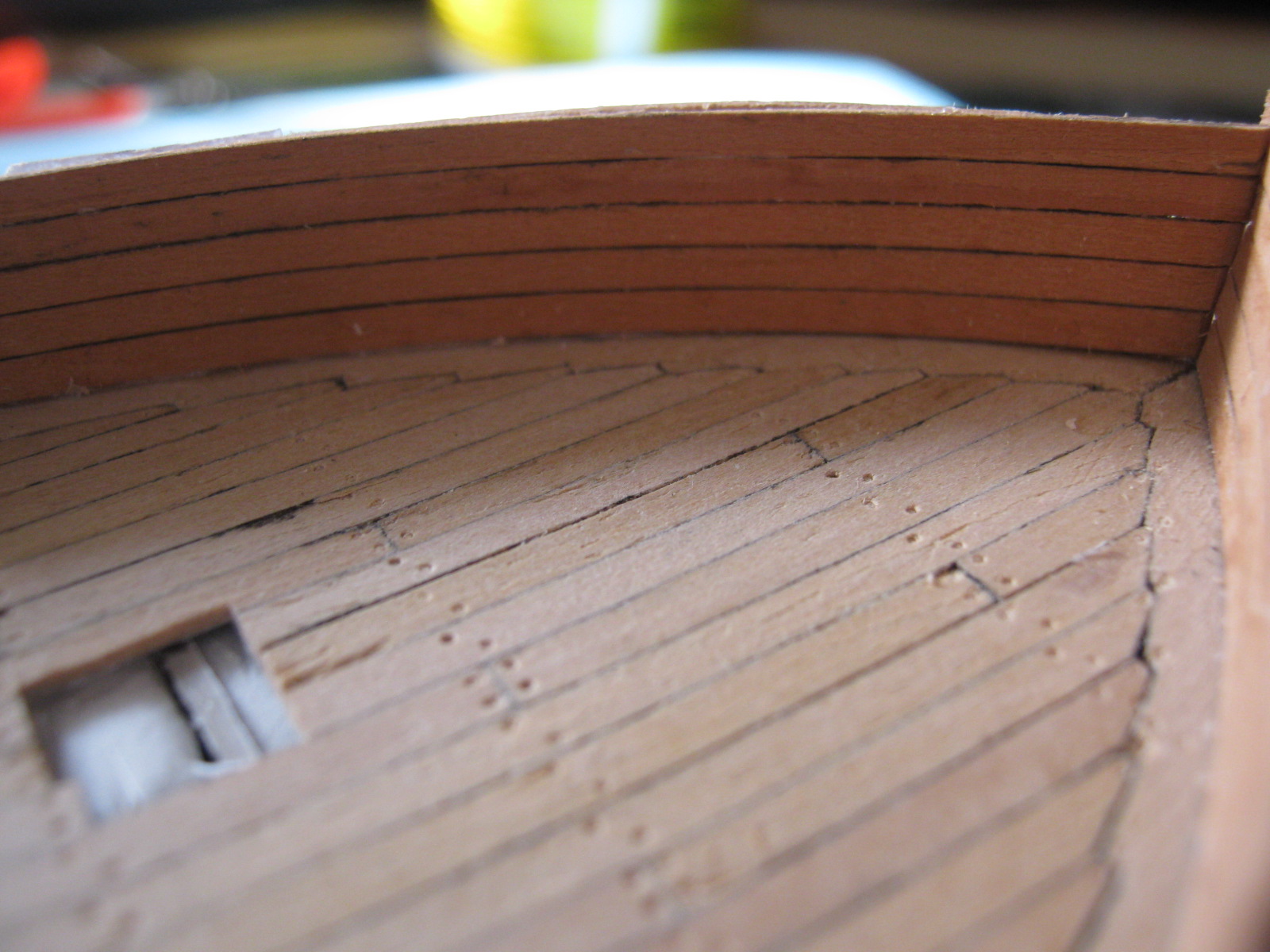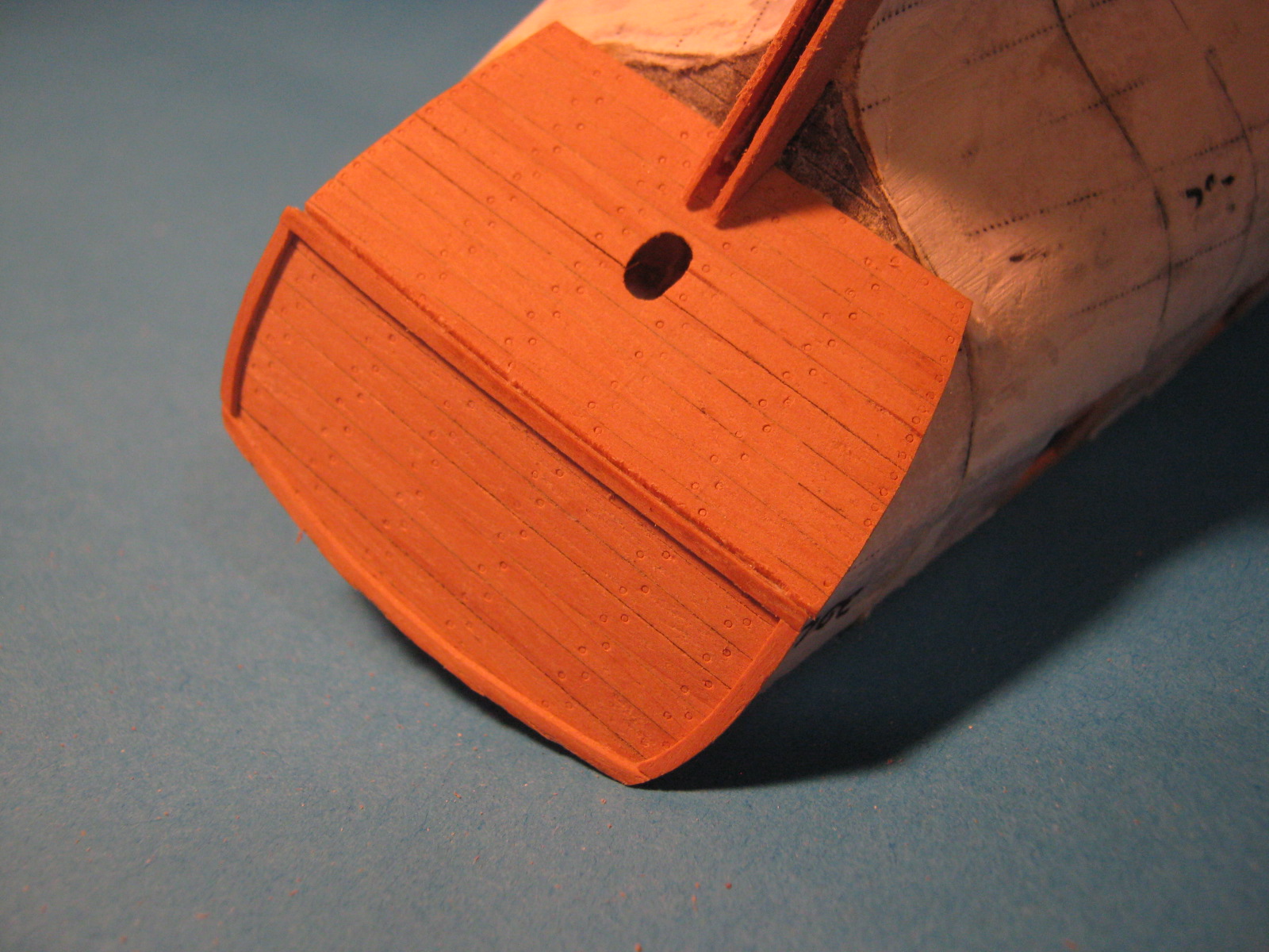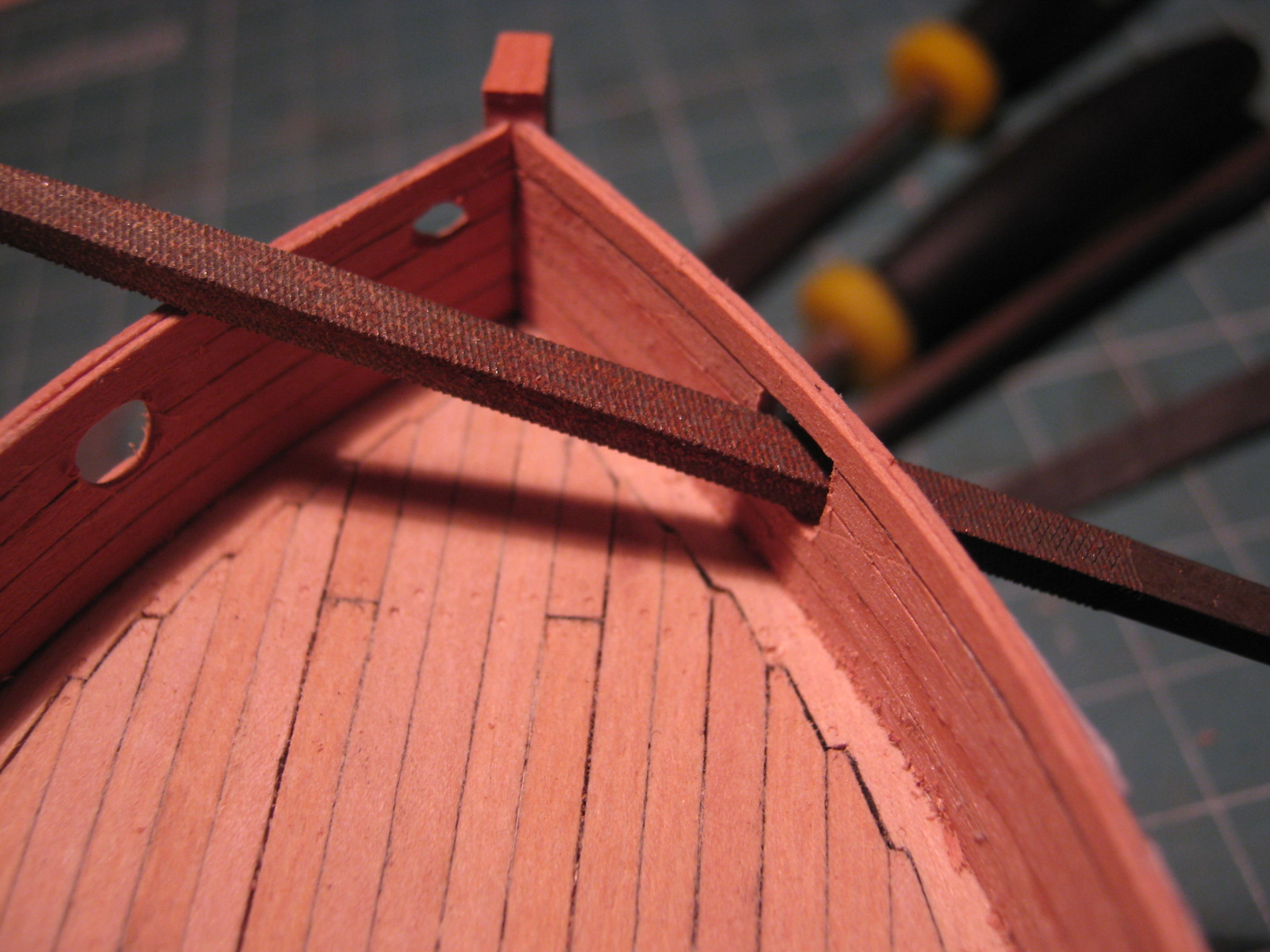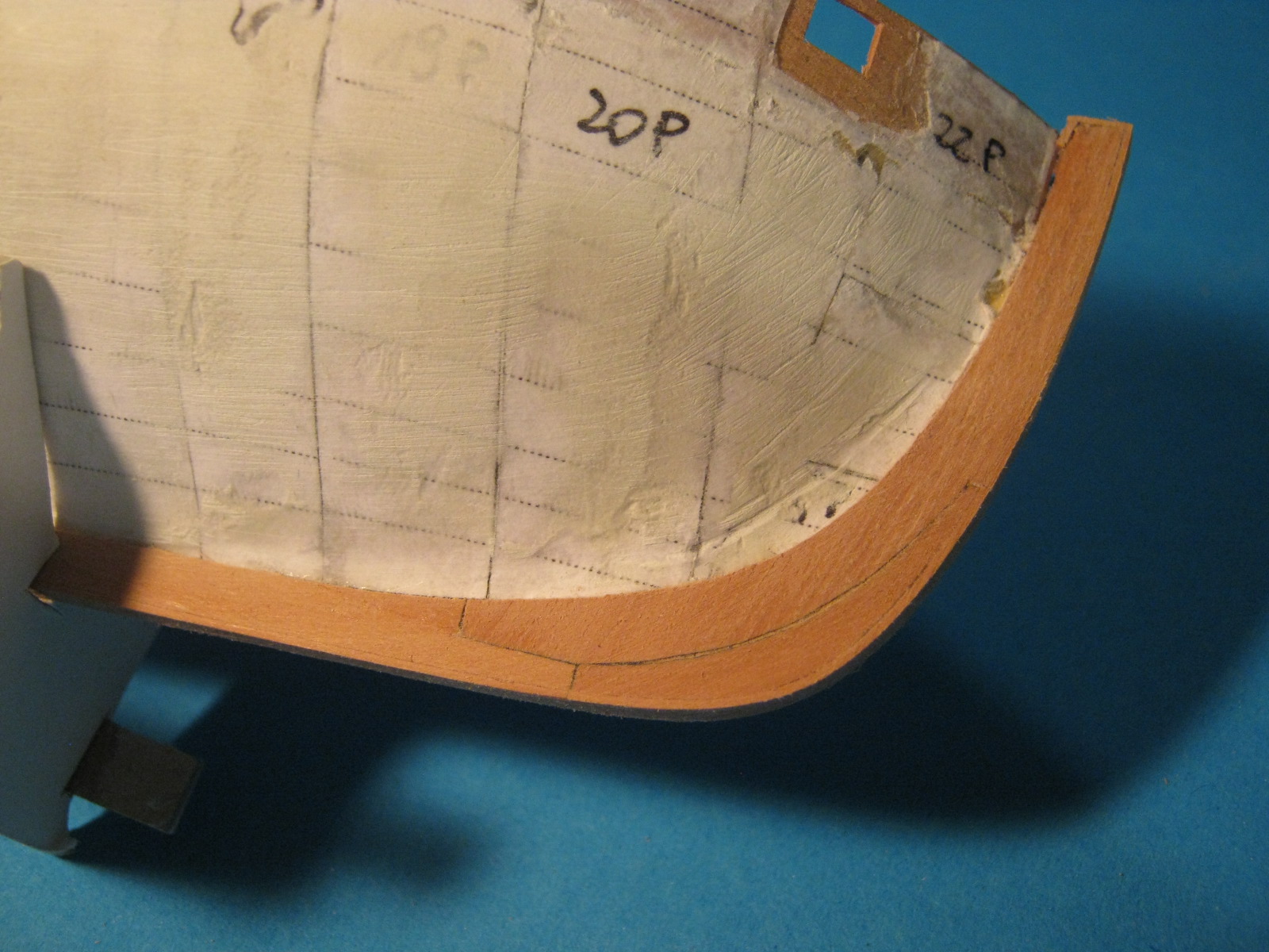 Wzmocniłem nadburcia jednym kawałkiem forniru (ależ ta grusza się chce wyginać!). Musiałem zostawić ten papier żeby mieć się czego złapać przy profilowaniu krzywizn. Teraz ten papier postaram się odkleić albo sfazować żeby był jak najbardziej cienki - taką to sobie technologię wymarzyłem.