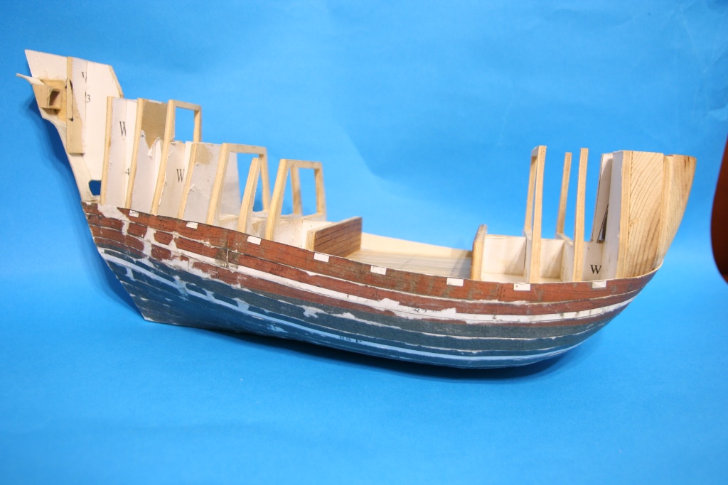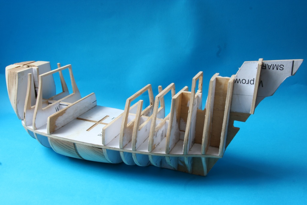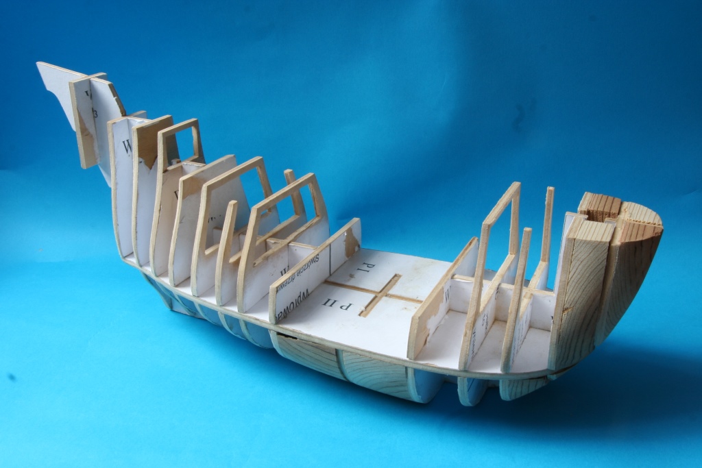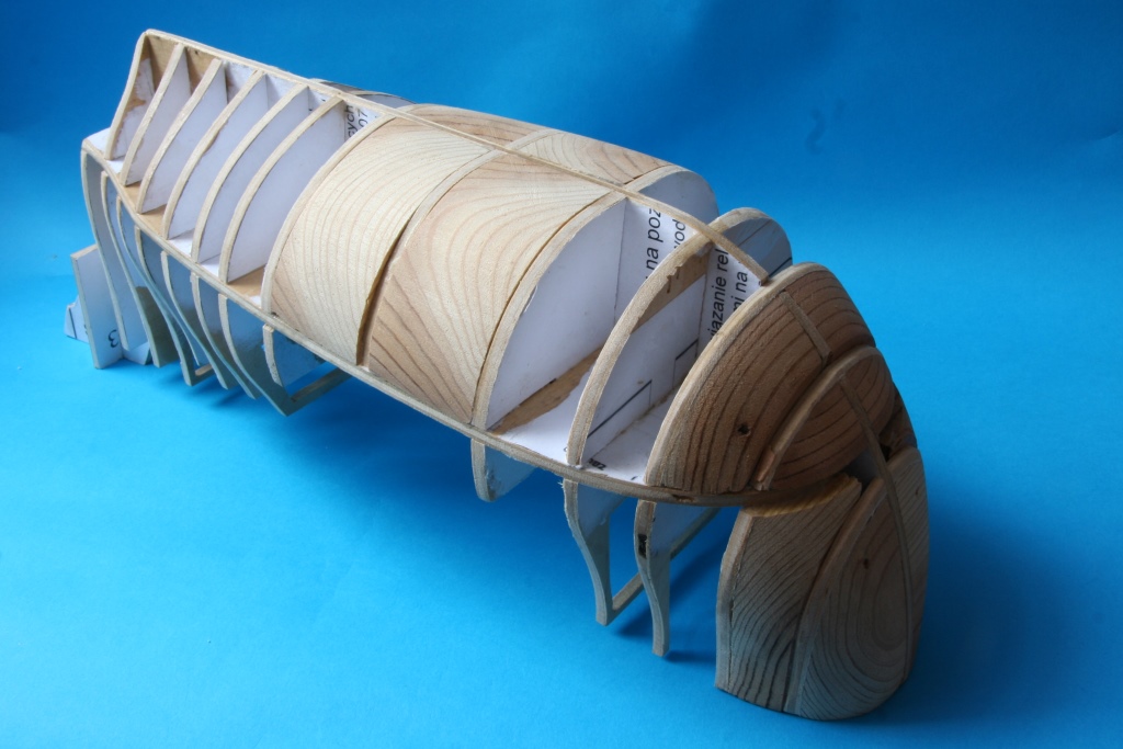 Na początek szkielet wykonany ze sklejki 4mm, większe przestrzenie między wręgami wypełnione kawałkami drewna.