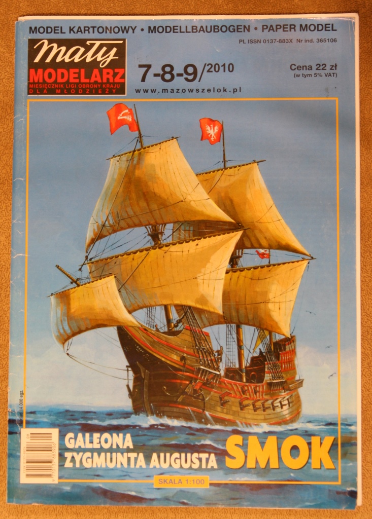 Model który trafił do mojej stoczni to "SMOK" Galeona Zygmunta Augusta. Budowę tego okrętu rozpoczęto w 1570r i niestety nie ukończono. (mam nadzieję, że chociaż mnie uda się zbudować model ;) ) Podstawą do wykonania będzie wycinanka z Małego Modelarza powiększona do skali 1:72 na podstawie próby rekonstrukcji tegoż okrętu przez M. Boczara. Tak naprawdę dokładny wygląd tego okrętu nie jest znany. Wycinanka jest bardzo ogólna, w szczególności olinowanie dlatego zamierzam opierać się dodatkowo na informacjach z ksiażki Boczara oraz wzorować na podobnych modelach z tej epoki - czyli pracach Kolegów :)
