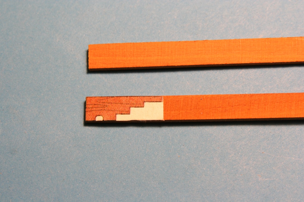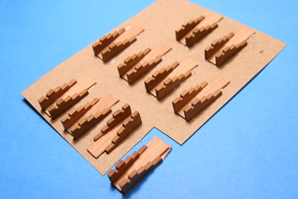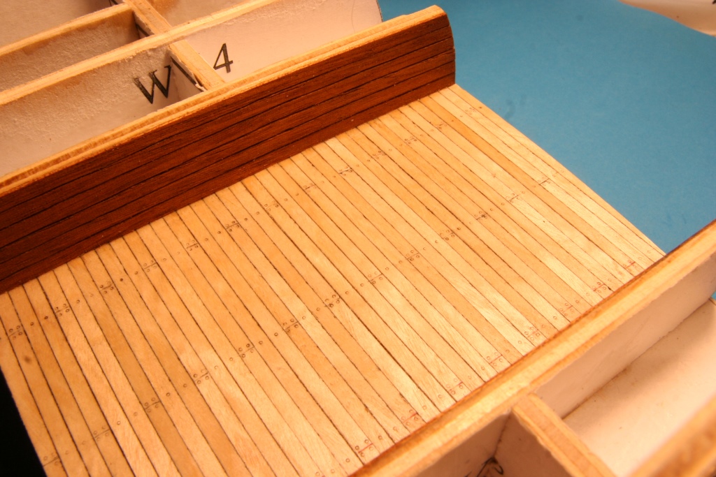 Okleiłem brzozą dolny pokład; imitację uszczelnienia spróbowałem zrobić inaczej niż zwykle a mianowicie do dość gęstego patexu dolałem czarny tusz i takim mazidłem przemalowałem krawędzie forniru (oczysiście w pakietach po kilkanaście szt) i wyszło ok. Planki kładłem przez całą długość i dopiero później nacinałem poprzecznie. Kołkowanie igłą 0,6. Pokłady maluję półmatem akrylowym z dwóch powodów - nie ma problemu z przyklejeniem innych elementów i po olejowniu 3v3, mazak lub tusz minimalnie się rozlewa. Scianki z machoniu i tu olejowanie.
